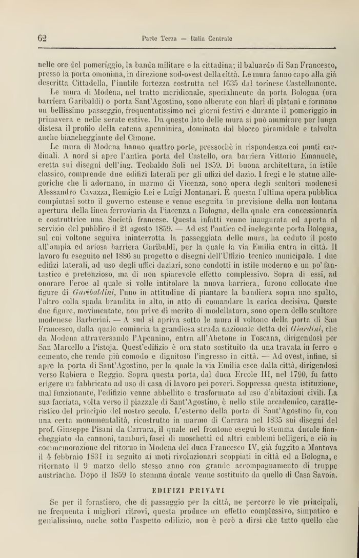 Le nutra di Modena hanno quattro porte, pressoché in rispondenza coi punti cardinali A nord si apre l'antica porta del Castello, ora barriera Vittorio Emanuele, eretta sui disegni dell'ing. Teobaldo Soli nel 1859. Di buona architettura, in istile classico, comprende due edilizi laterali per gli uffizi del dazio. L fregi e le statue allegoriche che li adornano, 111 marmo di Vicenza, sono opera degli scultori modenesi Alessandro Gavazza, Remigio Lei e Luigi Montanari. E questa l'ultima opera pubblica compiutasi sotto il governo estense e venne eseguita ni previsione della non lontana apertura della linea ferroviaria da Piacenza a Bologna, della quale era concessionaria e costruttrice una Società francese. Questa infatti venne inaugurata ed aperta al servizio del pubblico il 21 agosto 1S59. — Ad est l'antica ed inelegante porta Bologna, sul cui voltone seguiva ininterrotta la passeggiata delle munì, ha ceduto il posto all'ampia ed ariosa barriera Garibaldi, per la quale la via Emilia entra in città. 11 lavoro fu eseguito nel 188G su progetto e disegni dell'Uffizio tecnico municipale, f due edifizi laterali, ad uso degli uffici daziari, sono condotti in istile moderno e un po' fantastico e pretenzioso, ma di non spiacevole effetto complessivo. Sopra di essi, ad onorare l'eroe al quale si volle intitolare la nuova barriera, furono collocate due figure di Garibaldini, l'uno in attitudine di piantare la bandiera sopra vino spalto, l'altro colla spada brandita ni alto, in atto di comandare la carica decisiva. Queste due ligure, movimentate, non pive di merito di modellatura, sono opera dello scultore modenese Barberini. — A sud si apriva sotto le mura il voltone della porta di San Francesco, dalla quale comincia la grandiosa strada nazionale detta dei Giardini, clic da Modena attraversando 1' \ pennino, entra all'Abetone in Toscana, dirigendosi pei San Marcello a Pistoja. Quest'edificio è ora stato sostituito da una travata ni ferro e cemento, che rende più comodo e dignitoso l'ingresso m città. — Ad ovest, infine, si apre la porta di Sant'Agostino, per la quale la via Emilia esce dalla città, dirigendosi verso Rubi era e Reggio. Sopra questa porta, dal duca Ercole III, nel 1790, fu fatto erigere un fabbricato ad uso di casa di lavoro pei poveri. Soppressa questa istituzione, mal funzionante, l'edilizio venne abbellito e trasformato ad uso d'abitazioni civili. La sua facciata, volta verso il piazzale di Sant'Agostino, è nello stile accademico, caratteristico del principio del nostro secolo. L'esterno della porta di Sant'Agostino fu, con una certa ìnonunieiitalità, ricostrutto m marmo di Carrara nel 1833 sui disegni del prof. Giuseppe Pisani da Carrara, il quale nel frontone esegui lo stemma ducale fiancheggiato da cannoni, tamburi, fasci di moschetti ed altri emblemi belligeri, e ciò in commemorazione del ritorno in Modena del duca Francesco IV, già fuggito a Mantova il 4 febbraio 1831 in seguito ai moti rivoluzionari scoppiati in città ed a Bologna, e ritornato il 'J marzo dello stesso anno con grande accompagnamento di truppe austriache. Dopo ti 1859 lo stemma ducale venne sostituito da quello di Casa Savoia.