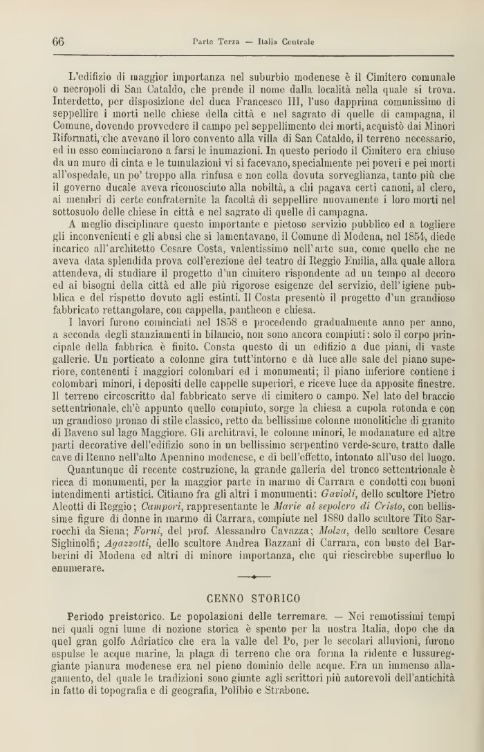 Periodo preistorico Le popolazioni delle terremare, — Nei remotissimi tempi nei quali ogni lume di nozione storica è spento per la nostra Italia, dopo che da quel gran golfo Adriatico che era la valle del Po, per le secolari alluvioni, furono espulse le acque marine, la plaga di terreno che ora forma la ridente e lussureggiante pianura modenese era nel pieno dominio delle acque. Era un immenso allagamento, del quale le tradizioni sono giunte agli scrittori più autorevoli dell'antichità in fatto di topografia e di geografia, Polibio e Strabene.