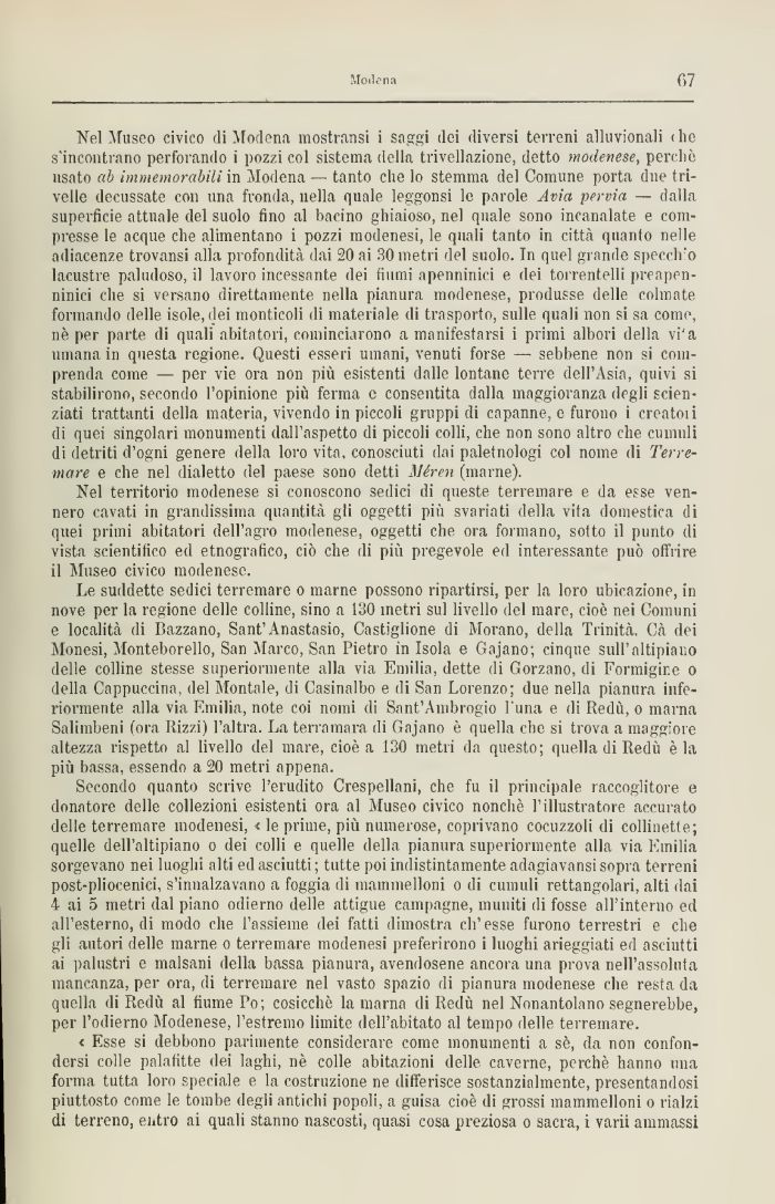 Nel Museo civico di Modena mostrarsi i saggi dei diversi terreni alluvionali die s'incontrano perforando i pozzi col sistema della trivellazione, detto modenese, perchè usato ab immemorabili in Modena — tanto che lo stemma del Comune porta dne trivelle decussate con una fronda, nella quale leggonsi le parole Avia pervia — dalla superficie attuale del suolo tino al bacino ghiaioso, nel quale sono incanalate e compresse le acque che alimentano i pozzi modenesi, le quali tanto in città quanto nelle adiacenze trovansi alla profondità dai 20 ai 30 metri del suolo. In quel grande specch'o lacustre paludoso, il lavoro incessante dei fiumi apenninici e dei torrentelli preaprn-ninici che si versano direttamente nella pianura modenese, produsse delle colmate formando delle isole, dei monti coli di materiale di trasporto, sulle quali non si sa come, nè per parte di quali abitatori, cominciarono a manifestarsi i primi albori della vi'a umana in questa regione. Questi esseri umani, venuti forse —- sebbene non si comprenda come — per vie ora non più esistenti dalle lontane terre dell'Asia, quivi si stabilirono, secondo l'opinione più ferma e consentita dalla maggioranza degli scienziati trattanti della materia, vivendo in piccoli gruppi di capanne, e furono i creatoli di quei singolari monumenti dall'aspetto di piccoli colli, che non sono altro che cumuli di detriti d'ogni genere della loro vita, conosciuti dai paletnologi col nome di Terre-mare e che nel dialetto del paese sono detti Méren (marne).
