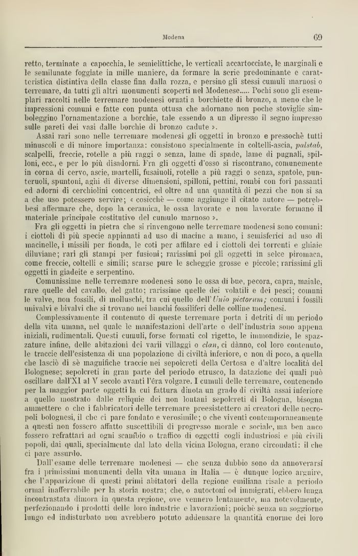 Ball esame delle terremare modenesi — che senza dubbio sono da annoverarsi fra i primissimi monumenti della vita umana in Italia -- è dunque logico arguire, che l'apparizione di questi pruni abitatori della regione emiliana risate a periodo ormai inafferrabile per la storia nostra; che, o autoctoni od immigrati, ebbero lunga incontrastata dimora in questa regione, ove vennero lentamente, ma notevolmente, perfezionando i prodotti delle loro industrie e lavorazioni ; poiché senza un soggiorno lungo ed indisturbato 11011 avrebbero potuto addensare la quantità enorme dei loro