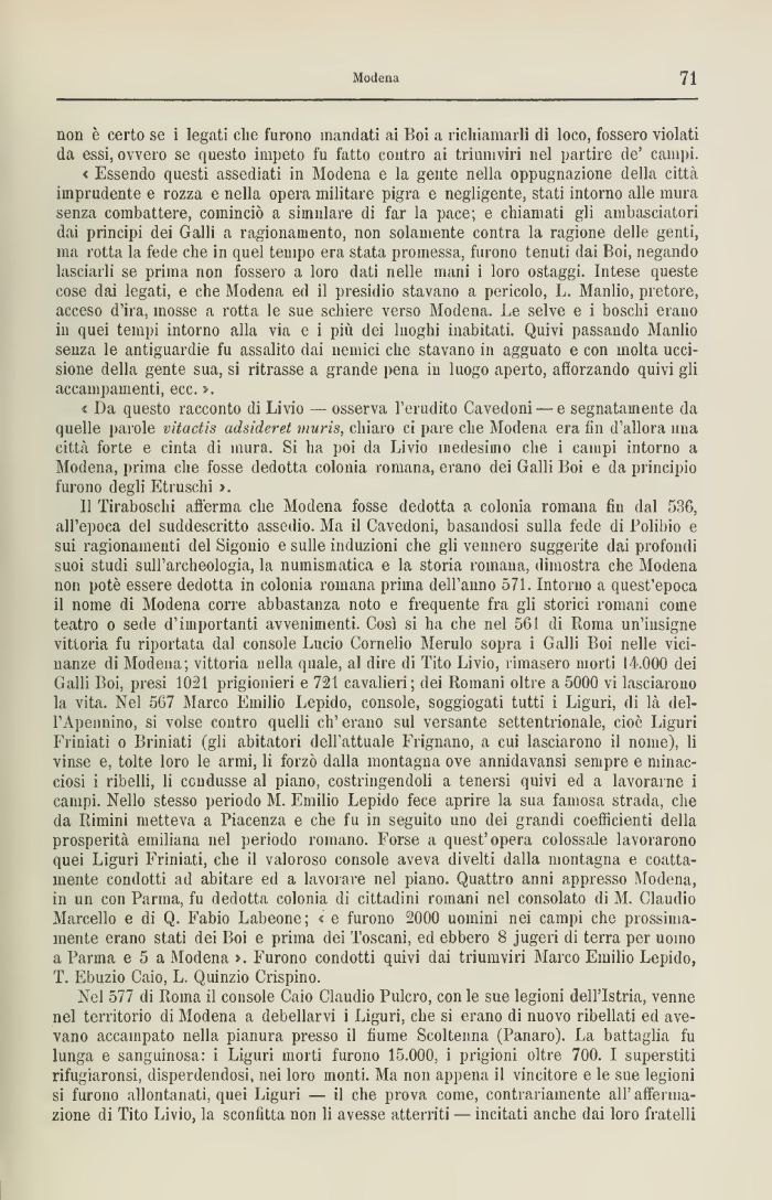 11 Tiraboschi afferma che Modena fosse dedotta a colonia romana fin dal 536, all'epoca del suddescritto assedio. Ma il Cavedoni, basandosi sulla fede di Polibio e sui ragionamenti del Sigouio e sulle induzioni che gli vennero suggerite dai profondi suoi studi sull'archeologia, la numismatica e la storia romana, dimostra che Modena non potè essere dedotta in colonia romana prima dell'anno 571. Intorno a quest'epoca il nome di Modena corre abbastanza noto e frequente fra gli storici romani come teatro o sede d'importanti avvenimenti. Così si ha che nel 5G1 di Roma un'insigne vittoria fu riportata dal console Lucio Cornelio Menilo sopra i Galli Boi nelle vicinanze di Modena; vittoria nella quale, al dire di Tito Livio, rimasero morti 14.000 dei Galli Boi, presi 1031 prigionieri e 721 cavalieri; dei Romani oltre a 5000 vi lasciarono la vita. Nel 567 Marco Emilio Lepido, console, soggiogati tutti i Liguri, dì là del-l'Apeiinino, si volse contro quelli eh' erano sul versante settentrionale, cioè Liguri Friniati o Briniati (gli abitatori dell'attuale Frignano, a cui lasciarono il nome), lì vinse e, tolte loro le armi, li forzò dalla montagna ove annidavano* sempre e minacciosi i ribelli, li condusse al piano, costringendoli a tenersi quivi ed a lavorarne i campi. Nello stesso periodo M. Emilio Lepido fece aprire la sua famosa strada, che da Rimini metteva a Piacenza e che fu 111 seguito uno dei grandi coefficienti della prosperità emiliana nel periodo romano. Forse a quest'opera colossale lavorarono quei Liguri Friniati, clic il valoroso console aveva divelti dalla montagna e coattamente condotti ad abitare ed a lavorare nel piano. Quattro anni appresso Modena, in un con Parma, fu dedotta colonia di cittadini romani nel consolato di M. Claudio Marcello e di Q. Fabio Labeone; « e furono 2000 uomini nei campi che prossimamente erano stati dei Boi e prima dei Toscani, ed ebbero 8 jugeri di terra per uomo a Parma e 5 a Modena >. Furono condotti quivi dai triumviri Marco Emilio Lepido, T. Ebuzio Caio, L. Quinzio Crispino.