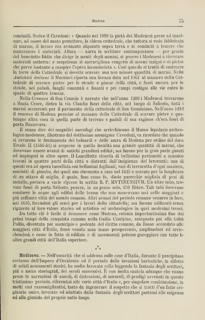 E senza dire dei magnifici sarcofagi che arricchiscono il Musco lapidario archeologico modenese, illustrato dal dottissimo monsignor Cavedoni, va ricordato che quando si cavarono le fondamenta dei baluardi e delle mura di Modena per ordine del duca Ercole II (1540-51) si scoperse, in quella località una grande quantità di marmi, che dovevano essere avanzi di antichi grandiosi edilizi ; ma furono per la gran parte guasti ed impiegati in altre opere II Lancillotto ricorda di bellissimi pavimenti a musaico trovati in quattro parti della città e distrutti dall'insipienza dei lavoranti: uno di questi era ad opera tassellata con bellissimi fogliami; vasi di terracotta d'ogni maniera, condotti di piombo, dei quali uno rinvenuto a caso nel 1025 e scavato per la lunghezza di un ottavo di miglio, il quale, fuso come fu, diede parecchie migliaia di pesi di metallo, portava a varie riprese la scritta II. I'. MVTINENSIVM. Un altro tubo, trovato fuori di porta Saliceto, pesava, in un pezzo solo, 150 libbre. Tali tubi dovevano condurre le acque agli edilìzi delle terme che non mancavano mai nelle maggiori e più raffinate città del mondo romano. Altri avanzi del periodo romano vennero in luce, nel 10:35, facendosi gli scavi per i lavori della cittadella; ma furono utilizzati senza riguardo al loro valore storico od artistico od archeologico in quei medesimi lavori.