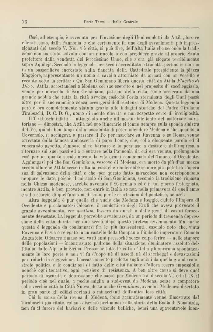 Così, ad esempio, è avvenuto per l'invasione degli Unni condotti da Attila, loro re efferatissimo, dalla Pantionia e che certamente fu uno degli avvenimenti più impressionanti del secolo V. Non v'è città, si può dire, dell'Alta Italia che secondo la tradizione non sia stata salvata con un miracolo o con preghiere grazie al proprio Santo protettore dalla vendetta del ferocissimo Unno, che s'era già sfogato terribilmente sopra Aquileja. Secondo la leggenda per secoli accreditata e tradotta perfino in marino in un bassorilievo incrostato sulla fiancata della Cattedrale prospiciente la piazza Maggiore, rappresentante un uomo a cavallo attorniato da armati con un vessillo e recante sotto la scritta: « Qui San Geminiano liberò questa città da Attila Flagello di l)ìo Attila, accostandosi a Modena col suo esercito e nel proposito di saccheggiarla, venne per miracolo di San Geminiano, patrono della città, come acci orato da una grande nebbia che tutta la città avvolse, cosicché l'orda sterminata degli Unni passò oltre per il suo cammino senza accorgersi dell'esistenza di Modena. Questa leggenda però è ora completamente sfatata grazie alle indagini storiche del Padre Girolamo Tiraboschi, I). C. I). G., uomo di mente elevata e non sospetto certo dì irreligiosità.