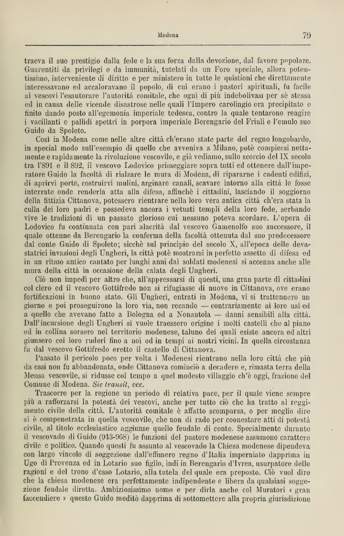Così ìli Modena come nelle altre città ch'erano state parte del regno longobardo, ili special modo sull'esempio di quello che avveniva a Milano, potè compiersi nettamente e rapidamente la rivoluzione vescovile, e già vediamo, sullo scorcio del IX secolo tra l'SOl e il 892, il vescovo Lodovico primeggiare sopra tutti ed ottenere dall'imperatore Guido la facoltà di rialzare le mura di Modena, di ripararne i cadenti edilizi, di aprirvi porte, costruirvi mulini, arginare canali, scavare intorno alla città le fosse interrate onde renderla atta alla difesa, affinchè i cittadini, lasciando il soggiorno della fittizia Cittanova, polissero rientrare nella loro vera antica città ch'era stata la culla dei loro padri e possedeva ancora i vetusti templi della loro fede, serbando vive le tradizioni di un passato glorioso cui nessuno poteva scordare. L'opera di Lodovico fu continuata con pari alacrità dal vescovo Gamenolfo suo successore, il quale ottenne da Berengario la conferma della facoltà ottenuta dal suo predecessore dal conte Guido di Spoleto; sicché sul principio del secolo X, all'epoca delle devastatrici invasioni degli Ungi ieri, la città potè mostrarsi in perfetto assetto di difesa ed in un ritmo antico cantato per lunghi anni dai soldati modenesi si accenna anche alle mura della città in occasione della calata degli Ungheri.