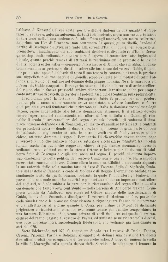 l'abbazia ili Nonautnla, il cui abate, per privilegi e diplomi di una quantità d'imperatori e re, aveva autorità autonoma da tutti indipendente, sopra una vasta estensione di territorio nella bassa modenese. A tale effetto egli manovrò, con molta scaltrezza, dapprima con Ugo dì Provenza; non contentato da questi, gli si ribellò, dandosi al partito di Berengario d'Ivrea aspirante alla corona d'Italia, il quale, per adescarlo gli prometteva l'esaudimento dei suoi ambiziosi desideri! e, diventato re d'Italia, Berengario, dopo molte esitanze, non tanto perchè sapeva di commettere atto ingiusto ed illegale, quanto perchè temeva di attirarsi le recriminazioni, le proteste e le invidie di altri potenti ecclesiastici — compreso l'arcivescovo di Milano che sull'abbazia nonan-tolana accampava pretese e diritti — aderì alle insistenze del vescovo Guido, il quale per primo atto spoglio l'abbazia dì tutto il suo tesoro in contanti e di tutta la preziosa sua suppellettile di vasi sacri e di gioielli; scopo evidente ed immediato di tutto l'affannarsi di Guido per entrare nel dominio della pingue abbazia. Nò si fermarono a ciò i favori da Guido strappati a Berengario: ottenne il titolo e la carica di arcicancelliere del regno, che lo faceva pressoché arbitro d'importanti investiture; ebbe per proprio conto investiture di castelli, di territorii e potestà assoluta e sconfinata sulla propria città.