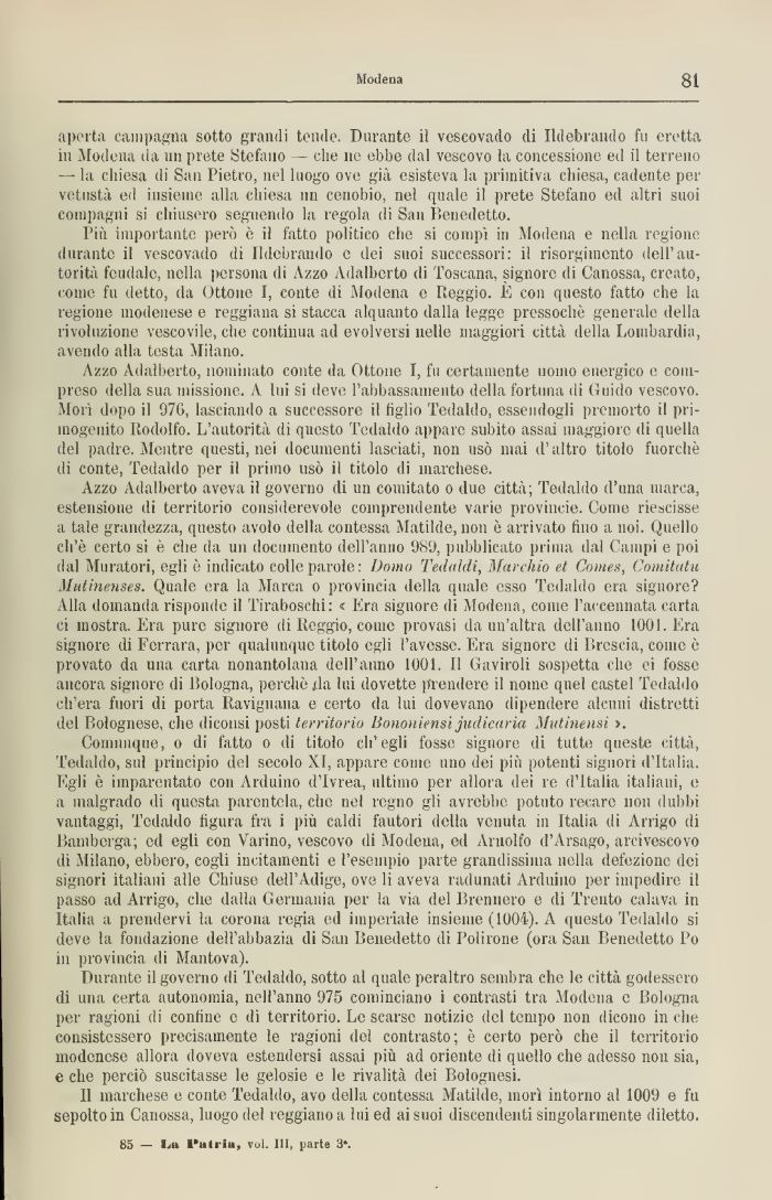 Azzo Adalberto aveva il governo di un comitato o due città; Tedaldo d'una marca, estensione di territorio considerevole comprendente varie Provincie. Come rieseisse a tale grandezza, questo avolo della contessa Matilde, non è arrivato fino a noi. Quello ch'è certo si è che da un documento dell'anno 989, pubblicato prima dal Campi e poi dal Muratori, egli è indicato colle parole: Domo Tedaldi, Marchio et Comes, Comitatu Mutinenses. Quale era la Marca o provincia della quale esso Tedaldo era signore? Alla domanda risponde il Tiraboschi: « Era signore di Modena, come l'accennata carta ci mostra. Era pure signore di Reggio, come provasi da un'altra dell'anno 1001. Era signore di Ferrara, per qualunque titolo egli l'avesse. Era signore di Brescia, come è provato da una carta nonantolaua dell'anno 1001. 11 Gaviroli sospetta che ei fosse ancora signore di Bologna, perchè ila lui dovette prendere il nome quel Castel Tedaldo ch'era fuori di porta Ravignana e certo da lui dovevano dipendere alcuni distretti del Bolognese, che diconsi posti territorio Bononiensi judicaria Mutinensì ».