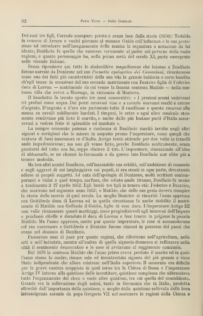 Senza riprodurre qui tutte le sbalorditive magnificenze che intorno a Bonifacio furono narrate da Donizone nel suo Poemetto apologetico dei Canosshmi, ricorderemo come uno dei fatti più caratteristici della stia vita la grande baldoria o corte bandita ch'egli tenne in occasione del suo secondo matrimonio con Beatrice figlia di Federico duca di Lorena — matrimonio da cui venne la famosa contessa Matilde — nella sontuosa villa che aveva a Moreugo, 111 vicinanza di Mantova.