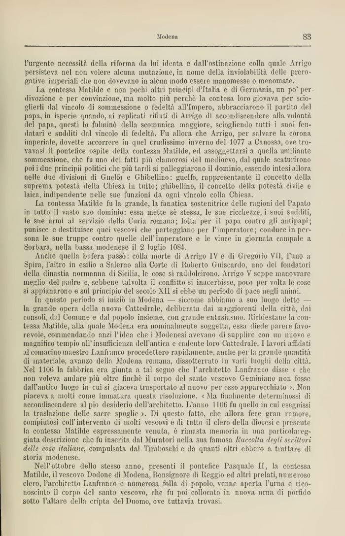 In questo periodo si iniziò in Modena — siccome abbiamo a suo luogo detto —-la grande opera della nuova Cattedrale, deliberata dai maggiorenti della città, dai consoli, dal Comune e dal popolo insieme, con grande entusiasmo. Richiestane la contessa Matilde, alla quale Modena era nominalmente soggetta, essa diede parere favorevole, commendando anzi l'idea che i Modenesi avevano di supplire con un nuovo e magnifico tempio all' insufficienza dell'antica e cadente loro Cattedrale. I lavori affidati al comacino maestro Lanfranco procedettero rapidamente, anche perla grande quantità di materiale, avanzo della Modena romana, dissotterrato in varii luoghi della città. Nel 1105 la fabbrica era giunta a tal segno che l'architetto Lanfranco disse < che non voleva andare più oltre finché il corpo del santo vescovo Geminiano non fosse dall'antico luogo in cui si giaceva trasportato al nuovo per esso apparecchiato ». Non piaceva a molti come immatura questa risoluzione. « Ma finalmente determinossi di accondiscendere al pio desiderio dell'architetto- L'anno 1106 fu quello in cui eseguissi la traslazione delle sacre spoglie Di questo fatto, che allora fece gran rumore, compiutosi coli'intervento di molti vescovi e di tutto il clero della diocesi e presente la contessa Matilde espressamente venuta, è rimasta memoria in una particolareggiata descrizione che fu inserita dal Muratori nella sua famosa Raccolta degli scrittori delle cose italiane, compulsata dal Tiraboschi e da quanti altri ebbero a trattare di storia modenese.