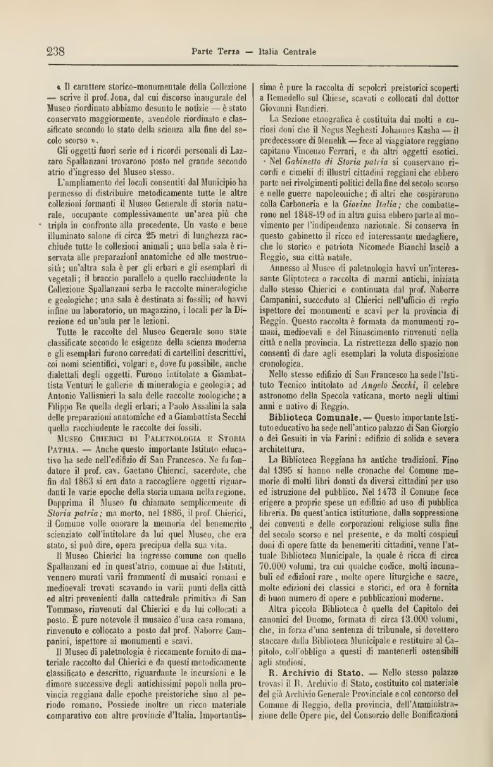 Museo Chierici di Paletnologia e Storia Patria. — Anche questo importante Istituto educativo ha sede nell'edifizio di San Francesco. Ne fu fondatore il prof. cav. Gaetano Chierici, sacerdote, che fin dal 1863 si era dato a raccogliere oggetti riguardanti le varie epoche della storia umana nella regione. Dapprima il Museo fu chiamato semplicemente di Storia patria ; ma morto, nel 1886, il prof. Chierici, il Comune volle onorare la memoria del benemerito scienziato coll'intitolare da lui quel Museo, che era stato, si può dire, opera precipua della sua v ita.