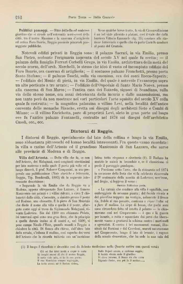 I dintorni di Reggio, specialmente dal lato della collina e lungo la via Emilia, sono abbastanza pittoreschi ed hanno località interessanti. Fra queste vanno ricordate: la villa o casino dell'Ariosto ed il grandioso Manicomio di San Lazzaro, che serve alle Provincie di Modena e di Reggio.