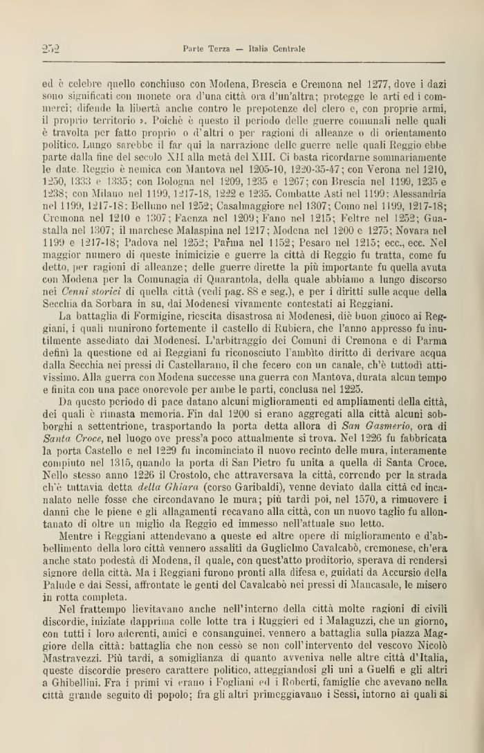 ed è celebre quello conchiuso con Modena, Brescia e Cremona nel 1277, dove i dazi sono significati con monete ora d'una città ora d'nn'altra; protegge le arti ed i commerci; difende la libertà anche contro le prepotenze del clero e, con proprie armi, il proprio territorio ». Poiché è questo il periodo delle guerre comunali nelle quali è travolta per fatto proprio o d'altri o per ragioni di alleanze o di orientamento politico. Lungo sarebbe ti far qui la narrazione delle guerre nelle quali Reggio ebbe parte dalla fine del secolo XII alla metà del XIII. Ci basta ricordarne sommariamente le date. Reggio è nemica con Mantova nel 1205-10, 1220-35-47; con Verona nel 1210, 1250, 1333 e 1335; con Bologna nel 1209, 1235 e 1267; con Brescia nel 1199, 1235 e 1238; con Milano nel 1199, 1217-18, 1222 e 1235. Combatte Asti nel 1199: Alessandria nel 1199, 1217-18: Belluno nel 1252; Casalmaggiore nel 1307; Como nel 1199, 1217-18; Cremona nel 1210 e 1307; Faenza nel 1209; Fano nel 1215; Feltra nel 1252; Guastalla nel 1307; il marchese Malaspina nel 1217; Modena nel 1200 e 1275; Novara nel 1199 e 1217-18; Padova nel 1252; Parma nel 1152; Pesaro nel 1215; ecc., ecc. Nel maggior numero di queste inimicizie e guerre la città di Reggio fu tratta, come fu detto, per ragioni di alleanze; delle guerre dirette la più importante fu quella avuta con Modena per la Coinunagia di Quarantola, della quale abbiamo a lungo discorso nei Cenyii storici di quella città (vedi pag. 88 e seg.), e per i diritti sulle acque della Secchia da Sorbara in su, dai Modenesi vivamente contestati ai Reggiani.