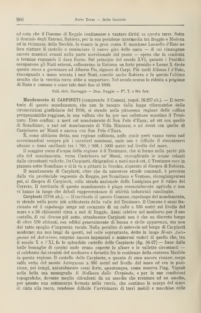 Carpineti (5794 ab.). — Il territorio di questo Comune, capoluogo del mandamento, si stende nella parte più addentrata della valle del Tresinaro. 11 Comune è assai frazionato ed il capoluogo sorge sul cocuzzolo di un colle a 556 metri sul livello del mare e a 36 chilometri circa a sud di Reggio. Assai celebre nel medioevo per il suo castello, di cui diremo più sotto, attualmente Carpineti non è che un discreto borgo di oltre 550 abitanti, con edifizi generalmente di buona e civile apparenza, ma non del tutto spoglio d'impronta rurale. Nulla peraltro di notevole nel borgo di Carpineti moderno; ma non lungi da questi, sul colle soprastante, detto in luogo Monte Ante-gnano od Anton inno, sorgono ancora imponenti e numerosi ruderi di quello che, tra il secolo X e l'XI, fu lo splendido castello delle Carpinete (fig. 36-37) — forse dalle belle boscaglie di carpini onde erano coperte le alture e le vallette circostanti — sì celebrato dai cronisti del medioevo e favorito fra le residenze della contessa Matilde in questa regione. Il castello delle Carpinete, o quanto di esso ancora rimane, sorge sulla vetta del monte Antegnano a 805 metri sul livello del mare ed era in posizione, pei tempi, naturalmente assai forte, quantunque, come osserva l'ing. Vigano nella bella sua monografia II Medioevo dalle Carpinete, < per le sue condizioni topografiche, dovesse meglio difendersi da un assedio che resistere ad un assalto, per quanto una sottoscarpa formata nella roccia, che continua la scarpa del muro di cinta alla rocca, rendesse difficile l'avvicinarsi di torri mobili e macchine colle