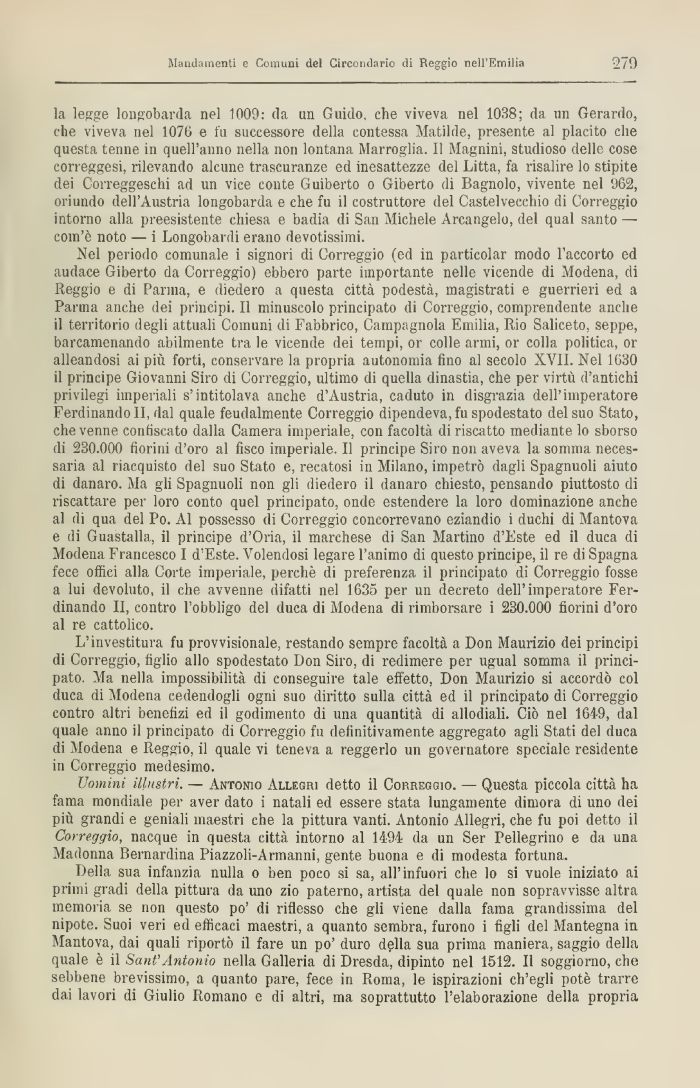 Uomini illustri. — Antonio Allegri detto il Correggio. — Questa piccola città ha fama mondiale per aver dato i natali ed essere stata lungamente dimora di uno dei più grandi e geniali maestri che la pittura vanti. Antonio Allegri, che fu poi detto il Correggio, nacque in questa città intorno al 1494 da un Ser Pellegrino e da una Madonna Bernardina Piazzoli-Armanni, gente buona e di modesta fortuna.