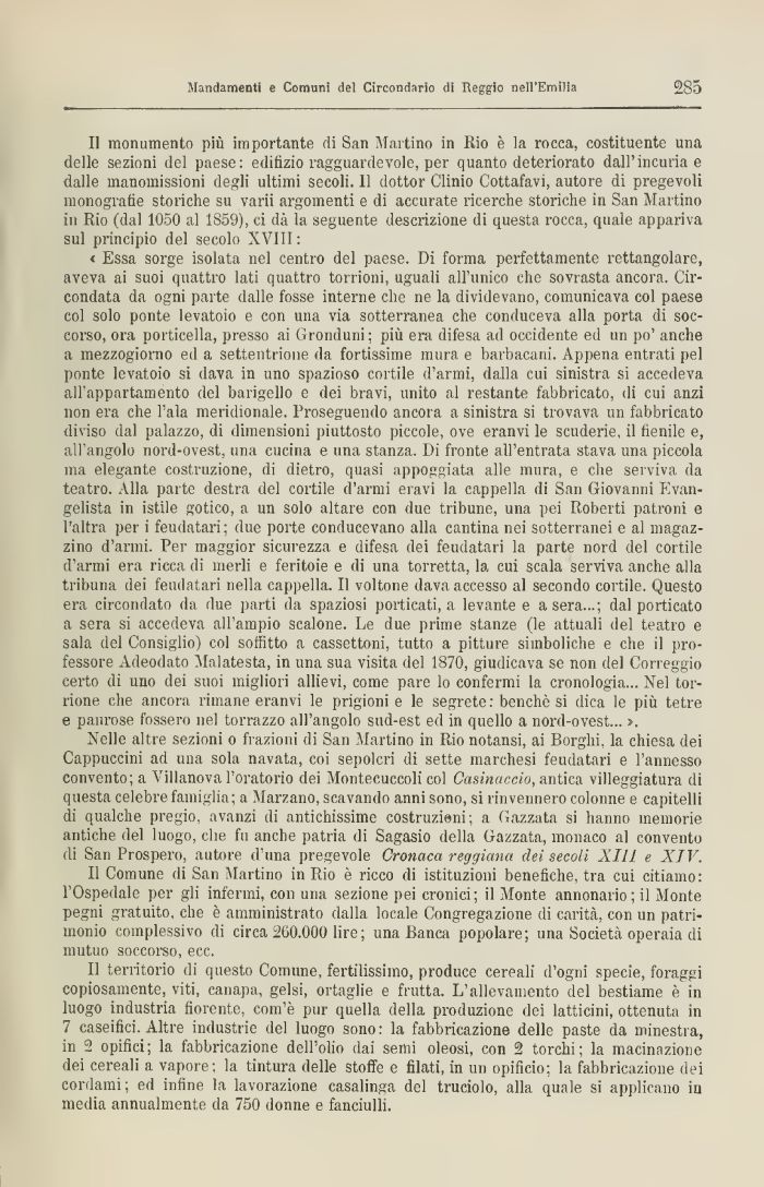 Il monumento più importante di San Mattino in Rio è la rocca, costituente una delle sezioni del paese: edilizio ragguardevole, per quanto deteriorato dall'incuria e dalle manomissioni degli ultimi secoli. 11 dottor Clinio Cottafavi, autore di pregevoli monografie storiche su varii argomenti e di accurate ricerche storiche in San Martino in Rio (dal 1050 al 1859), ci dà la seguente descrizione di questa rocca, quale appariva sul principio del secolo XVIII :