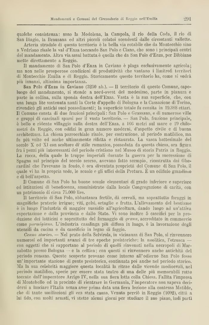 Cenno storico. — Nel prato della Selvirola, in vicinanza di San Polo, si rinvennero numerosi ed importanti avanzi di tre epoche preistoriche: la neolitica, l'etnisca — con oggetti che si rapportano al periodo di quelli rinvenuti nella necropoli di Mar-zabotto presso Bologna — e la celtica ; con questi si rinvennero anche antichità del periodo romano. Queste scoperte provano come intorno all'odierno San Polo fosse un' importante stazione di gente preistorica, continuata poi anche nel periodo storico. Ma la sua celebrità maggiore questa località la ritrae dalle vicende medioevali, nel periodo matildico, specie per essere stata teatro di una delle più memorabili rotte toccate dall'imperatore Arrigo IV, nella sua fiera lotta colla Chiesa. Fallita l'impresa di Montebello ed in procinto di rientrare in Germania, l'imperatore non sapeva decidersi a lasciare l'Italia senza aver prima data una fiera lezione alla contessa Matilde, che di tante umiliazioni gli era stata causa. Venuto perciò in Reggio (1092), città a lui fida, con molti armati, vi stette alcuni giorni per studiare il suo piano, indi partì