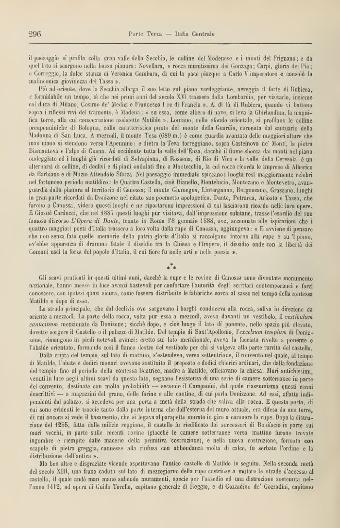 l'ili ad oriente, dove la Secchia allarga il suo letto sul piano verdeggiante, nereggia il forte di Rubiera, e formidabili? un tempo, sì che nei primi anni del secolo XVI trassero dalla Lombardia, per visitarlo, insieme col duca di Milano, Cosimo de' Medici e Francesco I re di Francia ». Al ili là di Rubiera, quando \i battono sopra i riflessi vivi del tramonto, è Modena; « su essa, come albero di nave, si leva la Ghirlandiiia, la magnifica torre, alla cui consacrazione assistette Matilde ». Lontano, nello sfondu orientale, si profilano le colline preapenniniche di Bologna, colla caratteristica punta del monte della Guardia, coronata dal santuario della Madonna di San Luca. A mezzodì, il monte Tesa (G89 m.) è come guardia avanzata delle maggiori alture che man mano si stendono verso l'Apemiìno : e dietro la Tesa torreggiano, sopra Castelnovo ne' Monti, la pietra Bismantova e l'alpe di Cusna. Ad occidente tutta la valle dell'Enza, dacché il fiume sbocca dai monti nel piano ondeggiato ed i luoghi già ricordati di Selvapiana, di Rossella, di Rio di Vico e la valle della Ce.resola, è un alternarsi di colline, di declivi e rli piani ondulati fino a Montecchio, la cui rocca ricorda le imprese di Alberico da Barbiano e di Muzio Attendolo Sforza. Nel paesaggio immediato spiccano i luoghi resi maggiormente celebri nel fortunoso periodo matildico: le Quattro Castella, cioè Rianello, Monte.lncio, Montezano e Montevetro, avanguardia dalla pianura al territorio di Canossa; il monte Giumegna, Lintergnano, Bergonzano, Grassano, luoghi ni gran parte ricordati da Donizone nel citato suo poemetto apologetico. Dante, Petrarca, Ariosto e Tasso, che furono a Canossa, videro questi luoghi e ne riportarono impressioni di cui lasciarono ricordo nelle loro opere. E Giosuè Carducci, che nel 18S7 questi luoghi pur visitava, dall'impressione subitane, trasse,l'esordio del suo famoso discorso VOpera di Dante, tenuto in Roma l'S gennaio 1888, ove, accennato alle ispirazioni che i quattro maggiori poeti d'Italia trassero a loro volta dalla rupe di Canossa, aggiungeva : « E avviene di pensare che non senza fato quelle memorie della patria gloria d'Italia si raccolgano intorno alla rupe e su '1 piano, ov'ebbe apparenza di dramma fatale il dissidio tra la Chiesa e l'Impero, il dissidio onde con la libertà dei