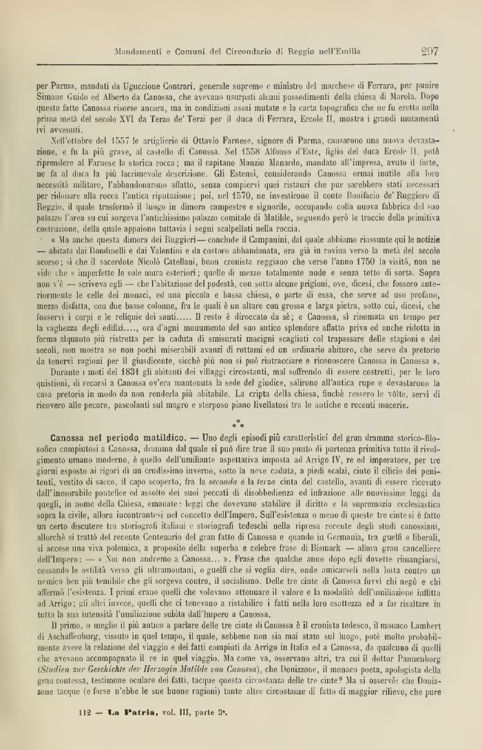 Canossa nel periodo matildico, —Uno degli episodi più caratteristici del gran dramma storico-filosofico compiutosi a Canossa, dramma dal quale si può dire trae il suo punto di partenza primitiva tutto il rivolgimento umano moderno, è quello dell'umiliante aspettativa imposta ad Arrigo IV, re ed imperatore, per tre giorni esposto ai rigori di un crudissimo inverno, sotto la neve caduta, a piedi scalzi, cinto il cilicio dei penitenti, vestito di sacco, il capo scoperto, fra la seconda e la terza cinta del castello, avanti di essere ricevuto dall'inesorabile pontefice ed assolto dei suoi peccati di disobbedienza ed infrazione alle nuovissime leggi da quegli, in nome della Chiesa, emanate : leggi che dovevano stabilire il diritto e la supremazia ecclesiastica sopra la civile, allora incontrantesi nel concetto dell'Impero. Sull'esistenza o meno di queste tre cintesi è fatto un certo discutere tra storiografi italiani e storiografi tedeschi nella ripresa recente degli studi canossiani, allorché si trattò del recente Centenario del gran fatto di Canossa e quando in Germania, tra guelfi e. liberali, si accese una viva polemica, a proposito della superba e celebre frase ili Bismark — allora gran cancelliere dell'Impero: — « Noi non andremo a Canossa... ». Frase che qualche anno dopo egli dovette rimangiarsi, cessando le ostilità verso gli ultramontani, o guelfi che si voglia dire, onde amicarseli nella lotta contro un nemico ben più temibile che gli sorgeva contro, il socialismo. Delle tre cinte di Canossa fuvvi chi negò e chi affermò l'esistenza. I pruni erano quelli che volevano attenuare il valore e la modalità dell'umiliazione inflitta ad Arrigo; gli altn invece, quelli che ci tenevano a ristabilire ì fatti nella loro esattezza ed a far risaltare iti tutta la sua intensità l'umiliazione subita dall'Impero a Canossa.
