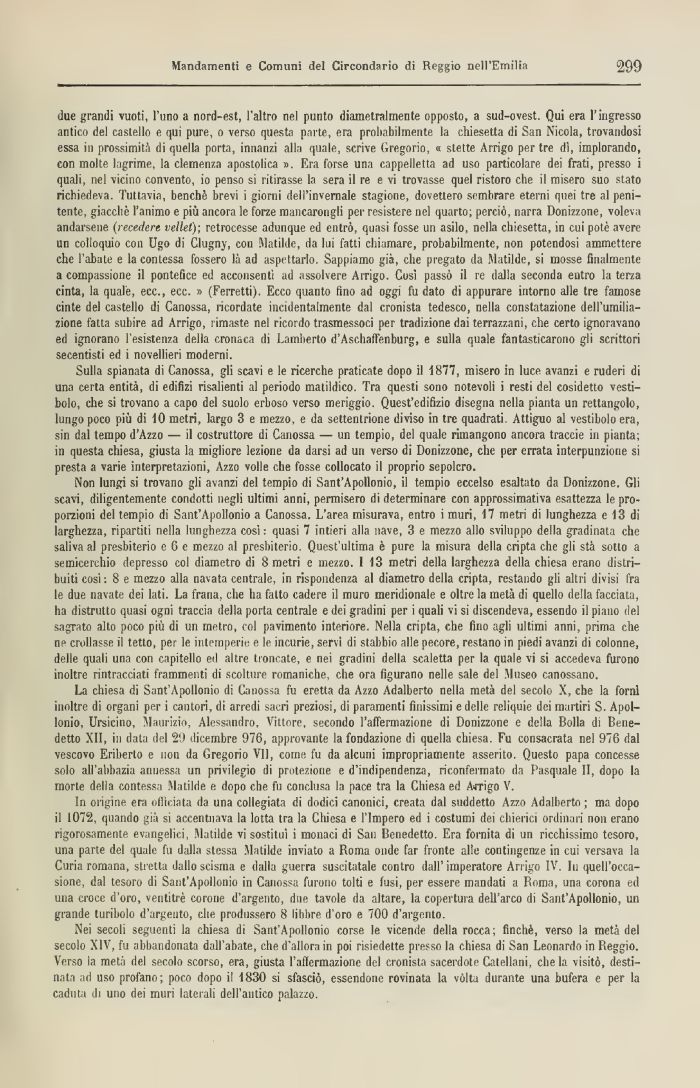due granili vuoti, l'uno a nord-est, l'altro nel punto diametralmente opposto, a sud-ovest. Qui era l'ingresso antico del castello e qui pure, o verso questa parte, era probabilmente la chiesetta di San Nicola, trovandosi essa in prossimità di quella porta, innanzi alla quale, scrive Gregorio, a stette Arrigo per tre dì, implorando, con molte lagrime, la clemenza apostolica ». Era forse una cappelletto ad uso particolare dei frati, presso i quali, nel vicino convento, io penso si ritirasse la sera il re e vi trovasse quei ristoro che il misero suo stato richiedeva. Tuttavia, benché brevi i giorni dell'invernale stagione, dovettero sembrare eterni quei tre al penitente, giacche l'animo e più ancora le forze mancarongli per resistere nel quarto; perciò, narra Donizzone, voleva andarsene (recedere velletY, retrocesse adunque ed entrò, quasi fosse un asilo, nella chiesetta, in cui potè avere un colloquio con Ugo di Clugny, con Matilde, da lui fatti chiamare, probabilmente, non potendosi ammettere che l'abate e la contessa fossero là ad aspettarlo. Sappiamo già, che pregato da Matilde, si mosse finalmente a compassione il pontefice ed acconsenti ad assolvere Arrigo. Così passò il re dalla seconda entro la terza cinta, la quale, ecc., ecc. » (Ferretti). Ecco quanto tino ad oggi fu dato di appurare intorno alle tre famose cinte del castello di Canossa, ricordate incidentalmente dal cronista tedesco, nella constatazione dell'umiliazione fatta subire ad Arrigo, rimaste nel ricordo trasmessoci per tradizione dai terrazzani, che certo ignoravano ed ignorano l'esistenza della cronaca di Lamberto d'Aschaflfenburg, e sulla quale fantasticarono gli scrittori secentisti ed i novellieri moderni.