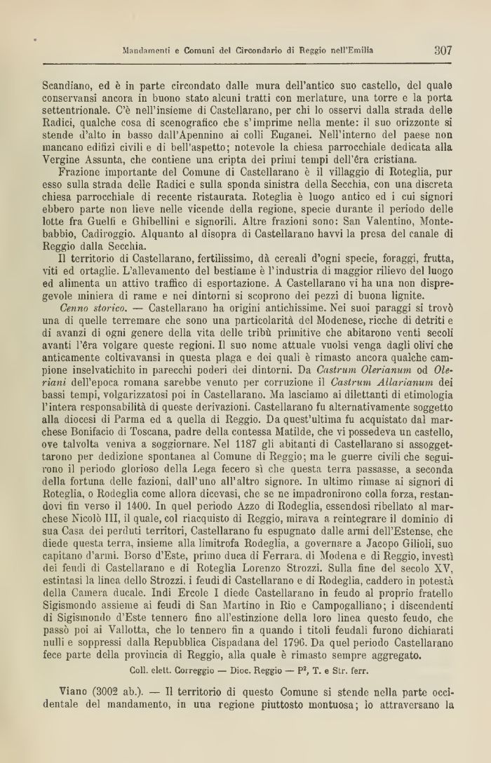 Cenno storico. — Castellarauo ha origini antichissime. Nei suoi paraggi si trovò una di quelle terremare che sono una particolarità del Modenese, ricche di detriti e di avanzi di ogni genere della vita delle tribù primitive che abitarono venti secoli avanti l'èra volgare queste regioni. 11 suo nome attuale vuoisi venga dagli olivi che anticamente coltivavansi in questa plaga e dei quali è rimasto ancora qualche campione inselvatichito in parecchi poderi dei dintorni. Da Castrimi Olerianum od Ole-riami dell'epoca romana sarebbe venuto per corruzione il Castrimi Ailarianum dei bassi tempi, volgarizzatosi poi in Castellarauo. Ma lasciamo ai dilettanti di etimologia l'intera responsabilità di queste derivazioni. Castellarano fu alternativamente soggetto alla diocesi di Parma ed a quella di Reggio. Da quest'ultima fu acquistato dal marchese Bonifacio di Toscana, padre della contessa Matilde, che vi possedeva un castello, ove talvolta veniva a soggiornare. Nel 1187 gli abitanti di Castellarano si assoggettarono per dedizione spontanea al Comune di Reggio; ma le guerre civili che seguirono il periodo glorioso della Lega fecero sì che questa terra passasse, a seconda della fortuna delle fazioni, dall'uno all'altro signore. In ultimo rimase ai signori di Roteglia, o Rodeglia come allora dicevasi, che se ne impadronirono colla forza, restandovi fin verso il 1400. In quel periodo Azzo di Rodeglia, essendosi ribellato al marchese Nicolò III, il quale, col riacquisto di Reggio, mirava a reintegrare il dominio di sua Casa dei perduti territori, Castellarano fu espugnato dalle armi dell'Estense, che diede questa terra, insieme alla limitrofa Rodeglia, a governare a Jacopo Gilioli, suo capitano d'armi. Borso d'Este, primo duca di Ferrara, di Modena e di Reggio, investì dei feudi di Castellarano e di Roteglia Lorenzo Strozzi. Sulla fine del secolo XV, estintasi la linea dello Strozzi i feudi di Castellarano e di Rodeglia, caddero in potestà della Camera ducale. Indi Ercole 1 diede Castellarano in feudo al proprio fratello Sigismondo assieme ai feudi di San Martino in Rio e Campogalliano; i discendenti di Sigismondo d'Este tennero fino all'estinzione della loro linea questo feudo, che passò poi ai Vallotta, che lo tennero fin a quando i titoli feudali furono dichiarati nulli e soppressi (Lalla Repubblica Cispadana del 1796. Da quel periodo Castellarauo fece parte della provincia di Reggio, alla quale è rimasto sempre aggregato.