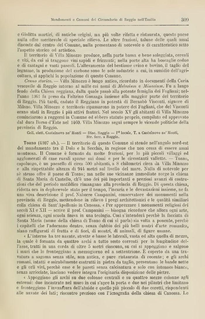 Toano (4107 ab.). — Il territorio di questo Comune si stende nell'angolo nord-est del mandamento tra il Dolo e la Secchia, in regione che non cessa di essere assai montuosa. Il Comune è formato da molte frazioni, per lo più piccoli villaggi ed agglomerati di case rurali sparse sui dossi e per le circostanti vallette. — Toano, capoluogo, è un paesello di circa oOO aiutanti, a 8 chilometri circa da Villa Minozzo e alla rispettabile altezza di 944 metri sul livello del mare. Nulla di notevole per se stesso offre il paese di Toano; ma nelle sue vicinanze immediate sorge la chiesa di Santa Maria di Castello, ch'è uno dei più importanti e preziosi avanzi di costruzioni che del periodo matildico rimangano alla provincia di Reggio. Di questa chiesa, ridotta ora in deplorevole stato per il tempo, l'incuria e le devastazioni insieme, ne fa una viva descrizione il prof. Naborre Campanini, conservatore dei monumenti nella provincia di Reggio, mettendone in rilievo i pregi architettonici e le qualità similiari colla chiesa di Sant'Apollonio in Canossa. < Per apprezzare i monumenti religiosi (lei secoli XI e XII — scrive il prof. Campanini — bisogna ricordare che allora ogni arte, ogni scienza, ogni scuola finiva in una teologia. Cosi s'intenderà perchè la facciata di Santa Maria (nome della chiesa di Toano di cui si parla) sia volta a ponente, perchè ì capitelli che l'adornano dentro, senza dubbio dei più belli nostri d'arte romanica, siano raffigurati di frutta e di fiori, di mostri, di animali, di figure umane.