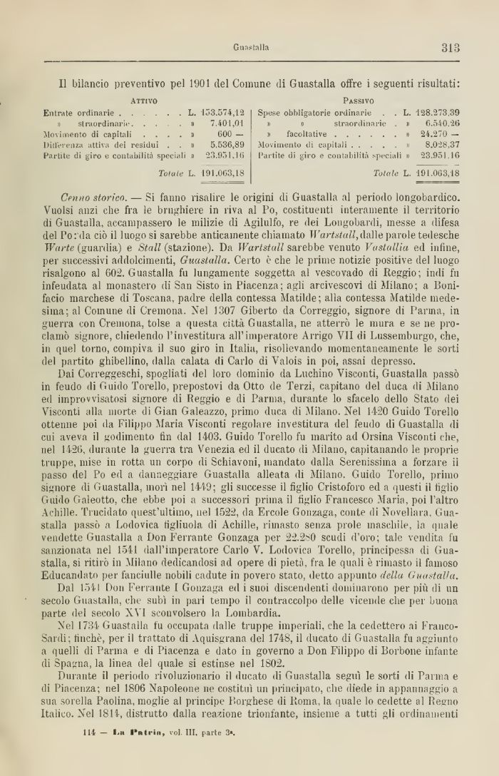 Il bilancio preventivo pel 1901 del Comune di Guastalla offre i seguenti risultati: