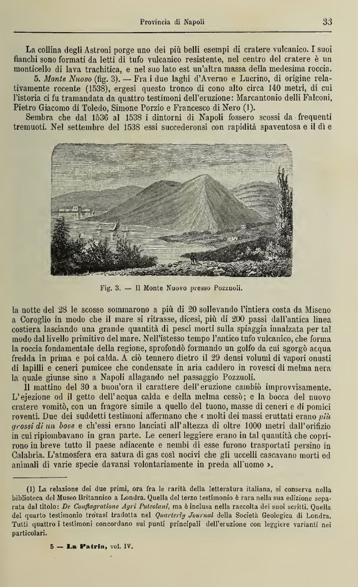 5. Monte Nuovo (tig. 3). — Fra i duo laghi d'Averne e Lucrino, di origine relativamente recente (1538), ergesi questo tronco di cono alto circa 140 metri, di cui l'istoria ci fu tramandata da quattro testimoni dell'eruzione: Marcantonio delli Falconi, Pietro Giacomo di Toledo, Simone Porzio e Francesco di Nero (1).