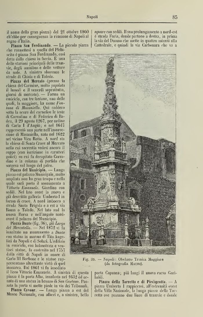 l'iam i)ante (fig. 36), già Largo del Mei-catello. — Nel 1872 vi fu innalzato nn monumento a Dante con statua in marmo di 'l'ilo Angelini da Napoli e di Solari. L'edilìzio in emiciclo, con balaustrata c ventisei statue, fu costruito nel 1757 dalla città di Napoli in onore di Carlo III Borbone e le statue rap- Fig,