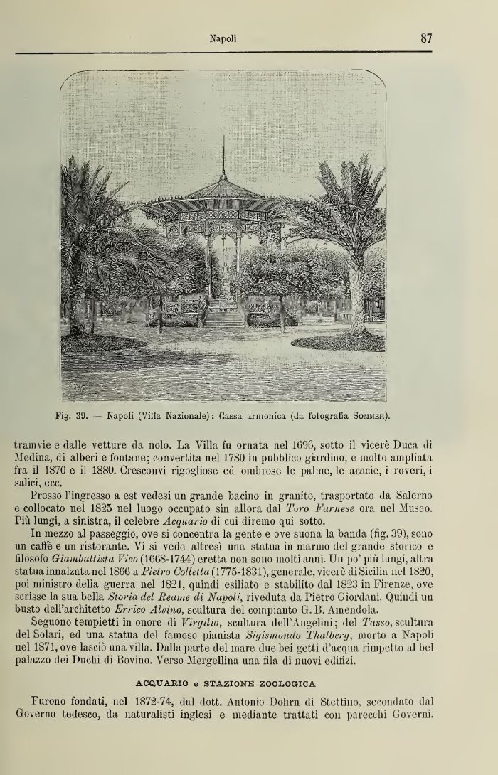 In mezzo al passeggio, ove si concentra la gente e ove suona la banda (fig. 39), sono un calie e un ristorante. Vi si vede altresì una statua in marmo del grande storico e filosofo Giambattista Vico (1668-1744) eretta non sono molti anni. Un po' più lungi, altra statua innalzata nel 1866aP/e/ro Colletta (1775-1831), generale, viceré di Sicilia nel 1820, poi ministro delia guerra nel 1821, quindi esiliato e stabilito dal 1823 in Firenze, ove scrisse la sua bella Storia del Beante di Napoli, riveduta da Pietro Giordani. Quindi un busto dell'architetto Errico Alvino, scultura del compianto G. B. Amendola.