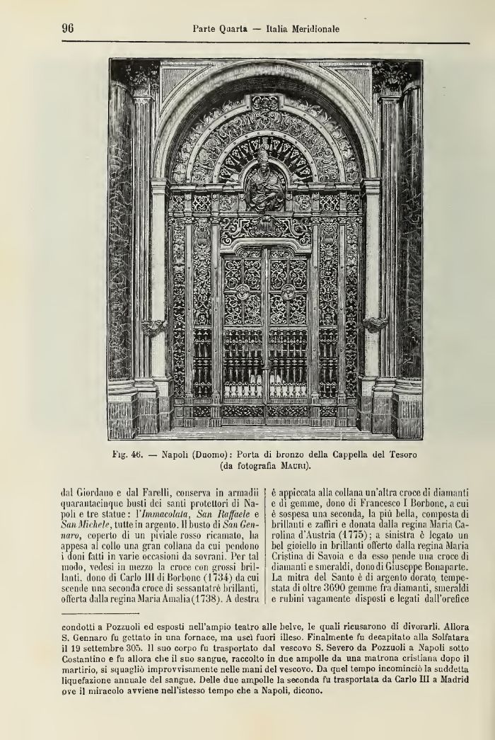 condotti a Pozzuoli ed esposti nell'ampio teatro alle belve, le quali ricusarono di divorarli. Allora S. Gennaro fu gettato in una fornace, ina usci fuori illeso. Finalmente fu decapitato alla Solfatara il 19 settembre 305. 11 suo corpo fu trasportato dal vescovo S. Severo da Pozzuoli a Napoli sotto Costantino e fu allora che il suo sangue, raccolto in due ampolle da una matrona cristiana dopo il martirio, si squagliò improvvisamente nelle mani del vescovo. Da quel tempo incominciò la suddetta liquefazione annuale del sangue. Delle due ampolle la seconda fu trasportata da Carlo III a Madrid pve il miracolo avviene nell'istesso tempo che a Napoli, dicono.