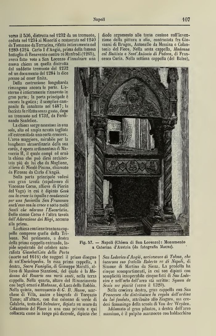 La chiesa contiene trentuna cappelle comprese quelle della Tribuna. Nel pavimento, a destra della prima cappella entrando, la- Fig- 57. — Napoli (Chiesa di San Lorenzo): Monumento pide sepolcrale del celebre natu- a Caterina d'Austria (da fotografìa Mauri).
