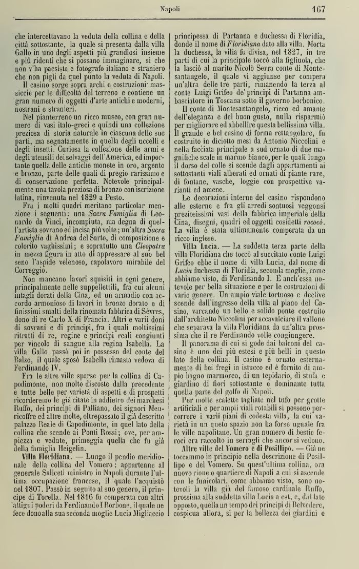 Villa Fluridiana. — Lungo il pendio meridionale della collina del Voniero : appartenne al generale Saliceti ministro in Napoli durante l'ultima occupazione francese, il quale l'acquistò nel '1807. Passò in seguito al suo genero, il principe di Torcila. Nel 1816 fu comperata con altri attigui poderi da Ferdinando I Borbone, ilquale ne fece donoalla sua seconda moglie Lucia .Migliaccio