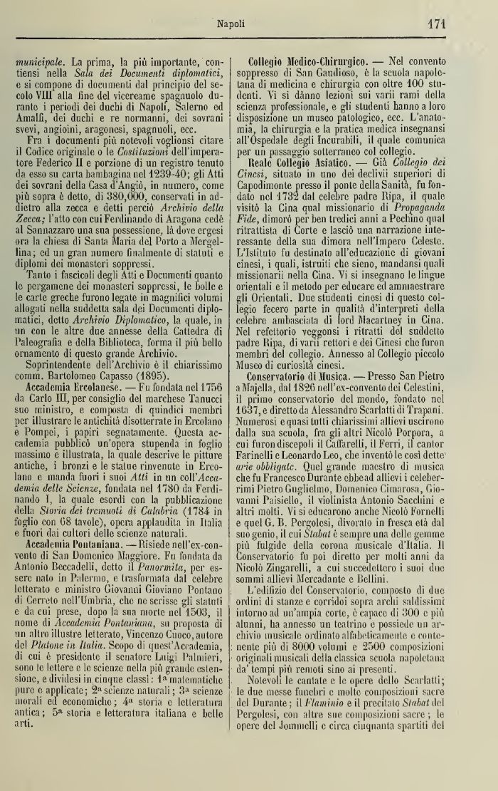 Resale Collegio Asiatico. — Già Collegio da Cinesi, situato in uno dei declivi! superiori di Capodimonte presso il ponte della Sanità, fu fondato nel 1732 dal celebre padre Ripa, il quale visitò la Cina qua! missionario di Propaganda Fide, dimorò per ben tredici anni a Pechino qual ritrattista di Corte e lasciò una narrazione interessante della sua dimora nell'Impero Celeste. L'Istituto fu destinato all'educazione di giovani cinesi, i quali, istruiti che sieno, mandansi quali missionari! nella Cina. Vi si insegnano le lingue orientali e il metodo per educare ed ammaestrare gli Orientali. Due studenti cinesi di questo collegio fecero parte in qualità d'interpreti della celebre ambasciala di lord Macartney in Cina, Nel refettorio veggonsi i ritratti del suddetto padre Ripa, divalli rettori e dei Cinesi chefuron membri del collegio. Annesso al Collegio piccolo Museo di curiositi cinesi.
