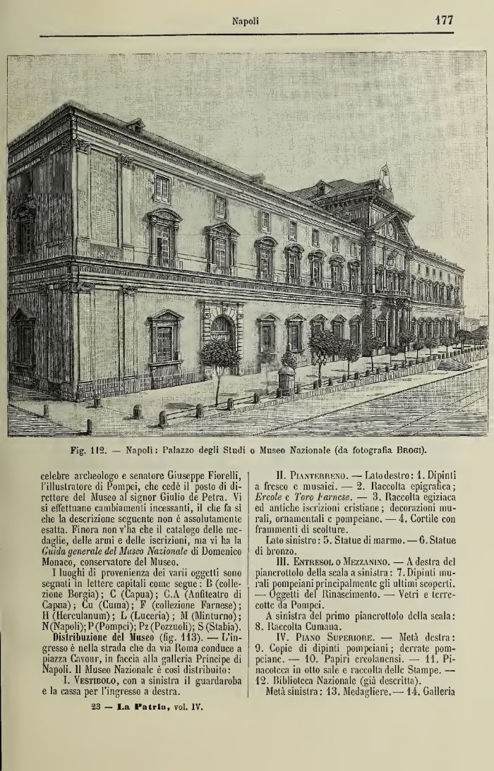 celebro archeologo e senatore Giuseppe Fiorelli, l'illustratore di Pompei, che cede il posto di direttore del Musco al signor Giulio de Petra. Vi si effettuano cambiamenti incessanti, il che fa si che la descrizione seguente non θ assolutamente esatta. Finora non v'ha che il catalogo dello medaglie, delle armi e delle iscrizioni, ma vi ha la Guida generale del Museo Nazionale di Domenico Monaco, conservatore del Musco.