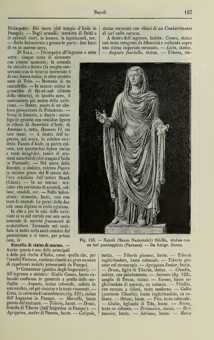 1° ConrtiDOio (portico degli Imperatori). All'ingresso a sinistra: Giulio Cesare, busto colossale conforme in generale a quello delle medaglie. - Augusto, statua colossale, seduta in una nicchia,col piς sinistro eia testa rinnovati. Livia, in costumedi sacerdotessa (fig. 121), statua dall'Augusteo in Pompei. Marcello, busto guasto dal restauro. - Tiberio, busto. Druso, fratello di Tiberio (dall'Augusteo in Pompei). Agrippina, madre di Nerone, busto. Caligola,