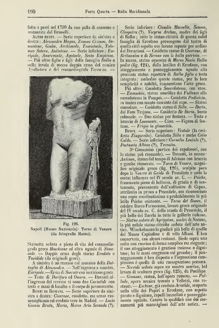 3° Corridoio (portico dei capolavori, con le statue più rinomate). — Davanti, in mezzo: Antiiioo, statua del tempo di Adriano con braccia e gambe rinnovale. — Torso di Venere, magnifico originale greco (fig. 126), scolpito poco dopo la Vemre di Gnido di Prassitele e sotto la costui influenza nel IV secolo av. C. — Psiche, frammento pieno di bellezza, di grazia e di sentimento, proveniente dall'anfiteatro di Capua, attribuito in prima a Prassitele, ora riconosciuto una copia eccellentissima e probabilmente la più bella Psiche esistente. — Torso del Baeeo, il celebre Bacco Farnesiano, lavoro greco originale del IV secolo av. C. della Scuola di Prassitele, il più hello dei Bacchi in tutte le gallerie italiane.