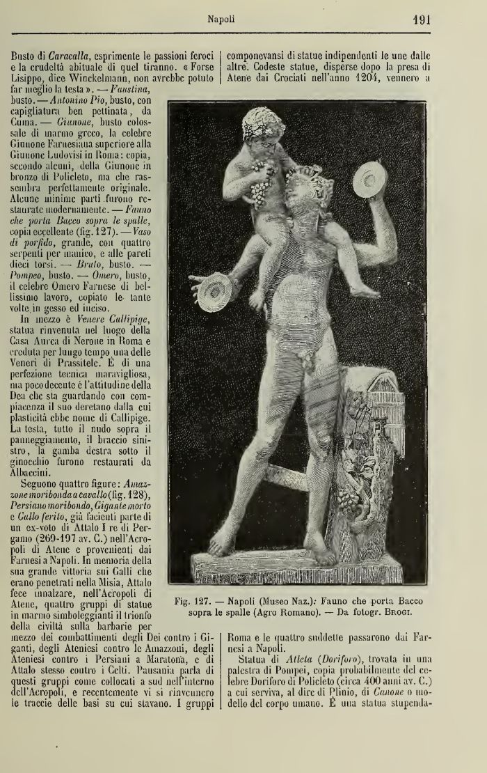 Busto dì Caracaìla, esprìmente le passioni feroc; e la crudeltà abituale di quel tiranno, « Forse Lisippo, dice Winckelmann, non avrebbe potuto far meglio la testa ». —» Faustina, busto. — Antonino Pio, busto, con capigliatura ben pettinata, da Guitta — Giunone, busto colossale di marmo greco, la celebre Giunone Faruesiana supcriore alla Giunone Ludovisi in lìoma: copia, secondo alcuni, della Giunone in bronzo di l'olicleto, ma clic ras-senibra perfettamente originale. Alcune minime parti furono restaurate modernamente. — Fauno che porla Bacco sopra le spalle, copia eccellente (lig. 127). —Vaso di porfido, grande, con quattro serpenti per manico, e alle pareti dieci torsi. Bruto, busto. -— Pompeo, busto. —- Omero, busto, il celebre Omero Farnese di bellissimo lavoro, copiato le- tante volte in gesso ed inciso.