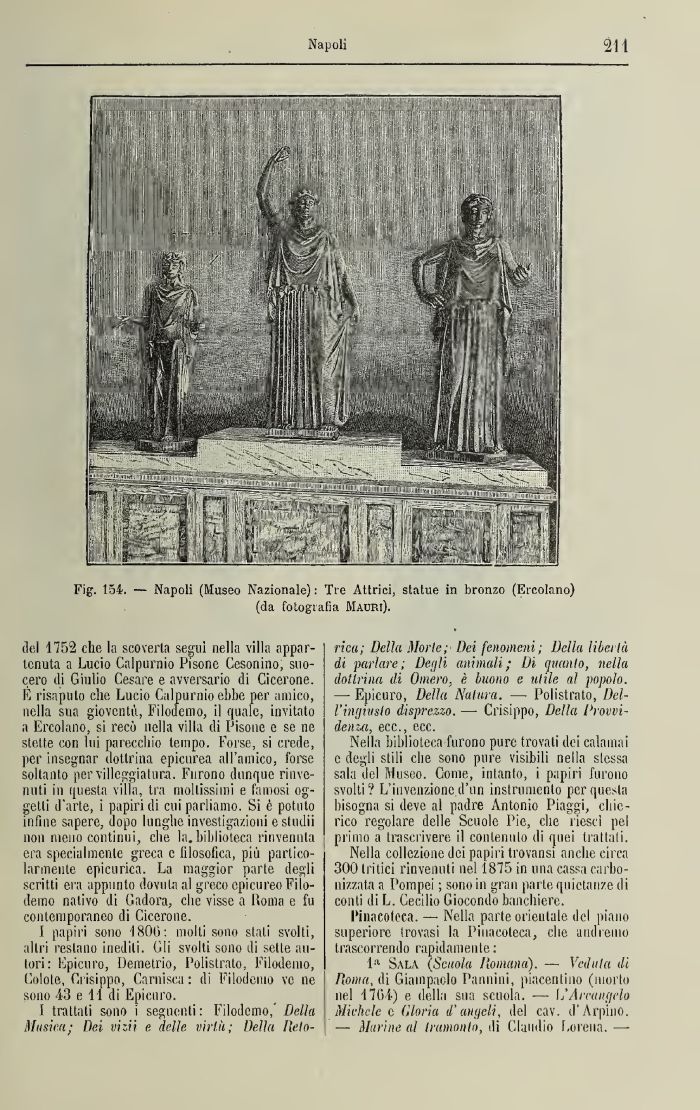 Nella biblioteca furono pure trovali dei calamai e degli stili che sono pure visibili nella slessa sala del Museo. Come, intanto, i papiri furono svolti? L'invenzione.d'un instrumento per questa bisogna si deve al padre Antonio Piaggi, chierico regolare delle Scuole Pie, clic riesci pel primo a trascrivere il conlenulo ili quei trattali