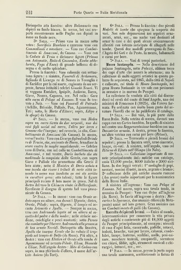 Musco Santangelo. — Nella descrizione del palazzo Santangelo, sotto Palazzi, abbiam tocco dei capi d'arte che ancora lo adornano; ma la collezione di molti oggetti artistici in questo palazzo fu acquistata, nel 1805, dalla città di Napoli e collocata, col titolo di Musco Santangelo, nel gran Museo Nazionale in tre sale con pavimenti in musaico e in marmo da Pompei.