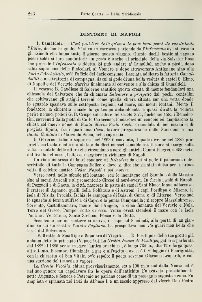 2. Grotte di Posillipo e Sepolcro di Virgilio, — Di Posillipo e delle sue grotte già abbiam detto in principio (V. pag. 2G). La Grotta Nuova di Posillipo, galleria perforata dal 1883 al 1885 per surrogare l'antica ora chiusa, è lunga 734 in., alta 12 e larga quasi altrettanto. È sempre illuminata a gas e all'uscita a ovest è il villaggio di Fuorigrotta, con la chiesetta di San Vitale, ov'è sepolto il poeta sovrano Giacomo Leopardi, e con una stazione del tramvia a vapore.