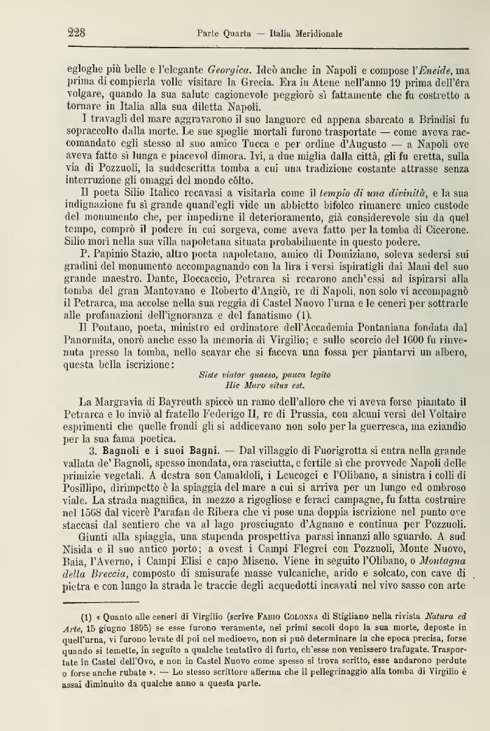 (1) « Quanto allo ceneri di Virgilio (scrivo Faiìio Colonna di Stigliano nella rivista Natura ed Arte, 15 giugno 1805) se esse furono veramente, nei jirimi secoli dopo la sua morte, deposto in quell'urna, vi furono levate di poi nel medioevo, non si può determinare ili che epoca precisa, forse quando si temette, in seguito a qualche tentativo di furto, ch'esse non venissero trafugate. Trasportate in Castel dcll'OvO, e non in Castel Nuovo come spesso si trova scritto, esse andarono perdute o forse anche rubate » — Lo stesso scrittore afferma che il pellegrinaggio alla tomba di Virgilio è assai diminuito da qualche anno a questa parte.