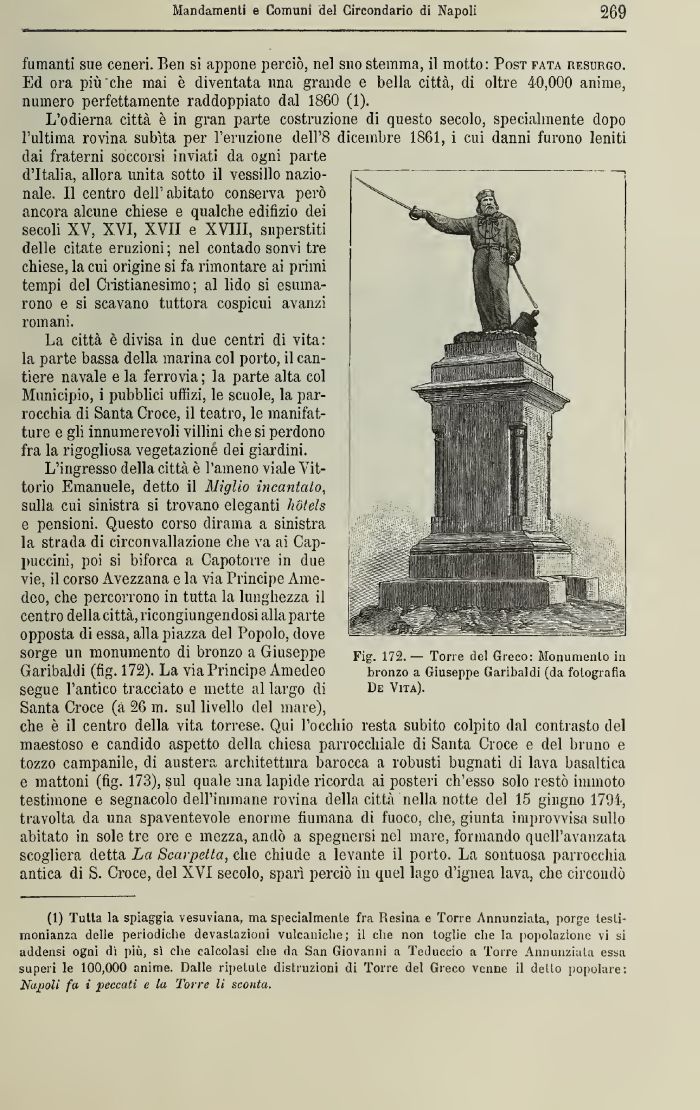 (1) Tutta la spiaggia vesuviana, ma specialmente fra Resina e Torre Annunziata, porge testimonianza delle periodiche devastazioni vulcaniche; il che non toglie che la popolazione vi si addensi ogni dì più, sì che calcolasi che da San Giovanni a Teduccio a Torre Annunziata ossa superi le 100,000 anime. Dalle ripetute distruzioni di Torre del Greco venne il detto popolare: Napoli fu i peccati e la Torre li aconta.