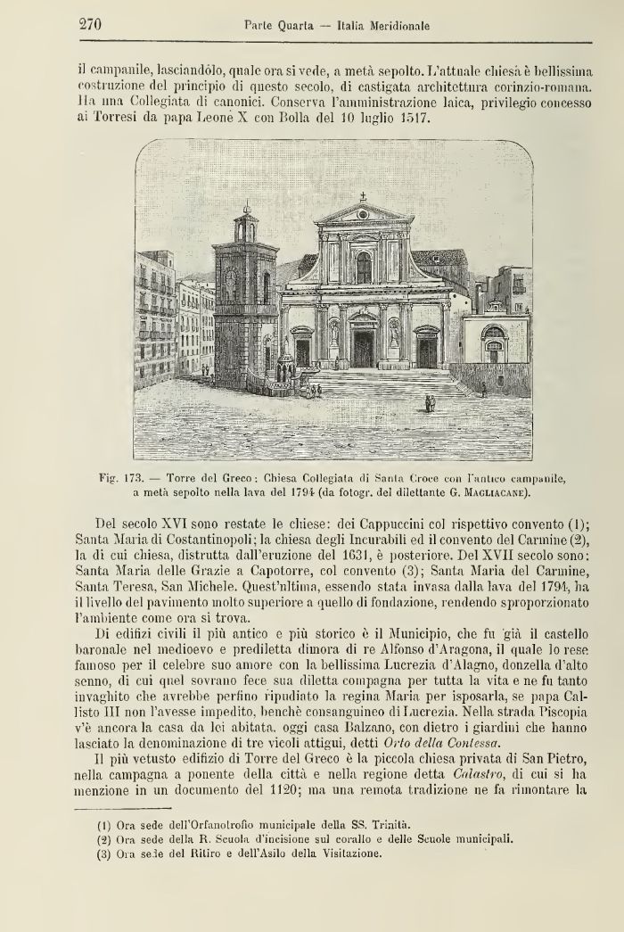 Fig. 173. — Torre del Greco: Chiesa Collegiata di Santa Croce con l'antico campanile, a metà sepolto nella lava del 1791- (da l'otogr. del dilettante G. Magliacane).