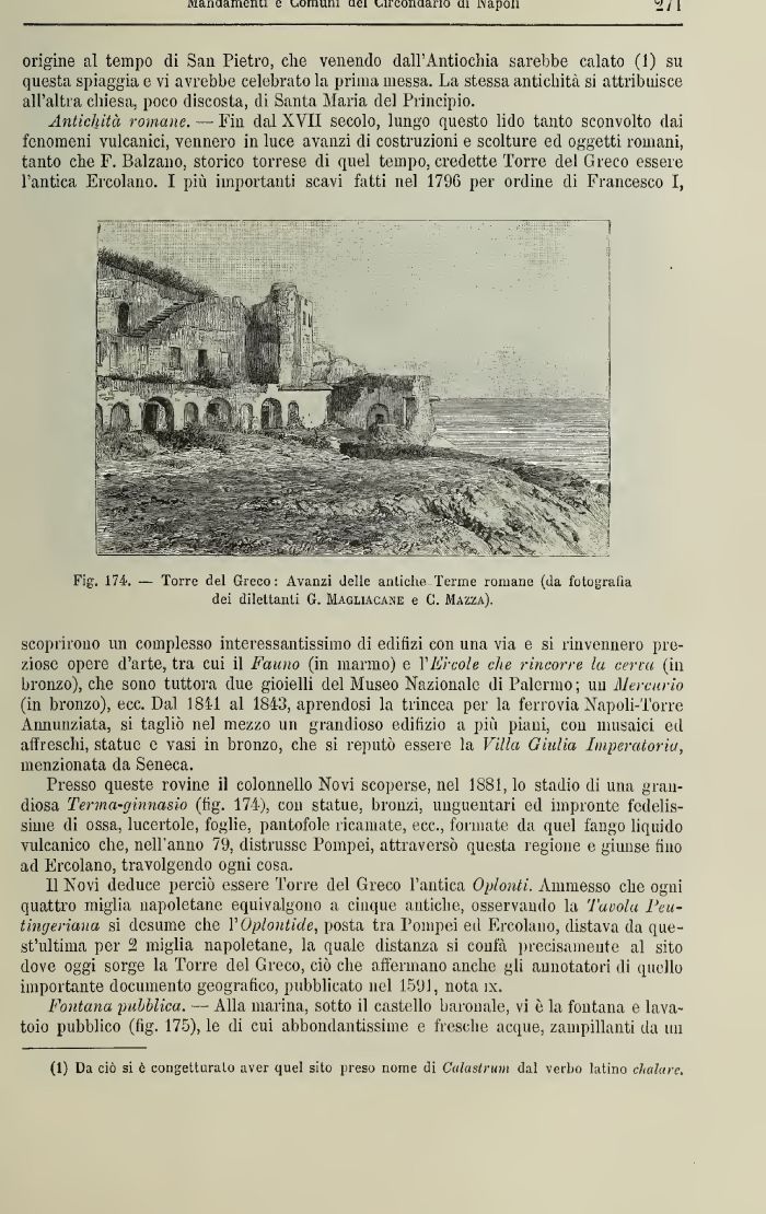 Presso queste rovine il colonnello Novi scoperse, nel 1881, lo stadio (li una grandiosa Terma-ginnasio (fig. 174), con statue, bronzi, unguentari ed impronte fedelissime di ossa, lucertole, foglie, pantofole ricamate, ecc., formate da quel fango liquido vulcanico che, nell'anno 79, distrusse Pompei, attraversò questa regione e giunse fino ad Ercolano, travolgendo ogni cosa.