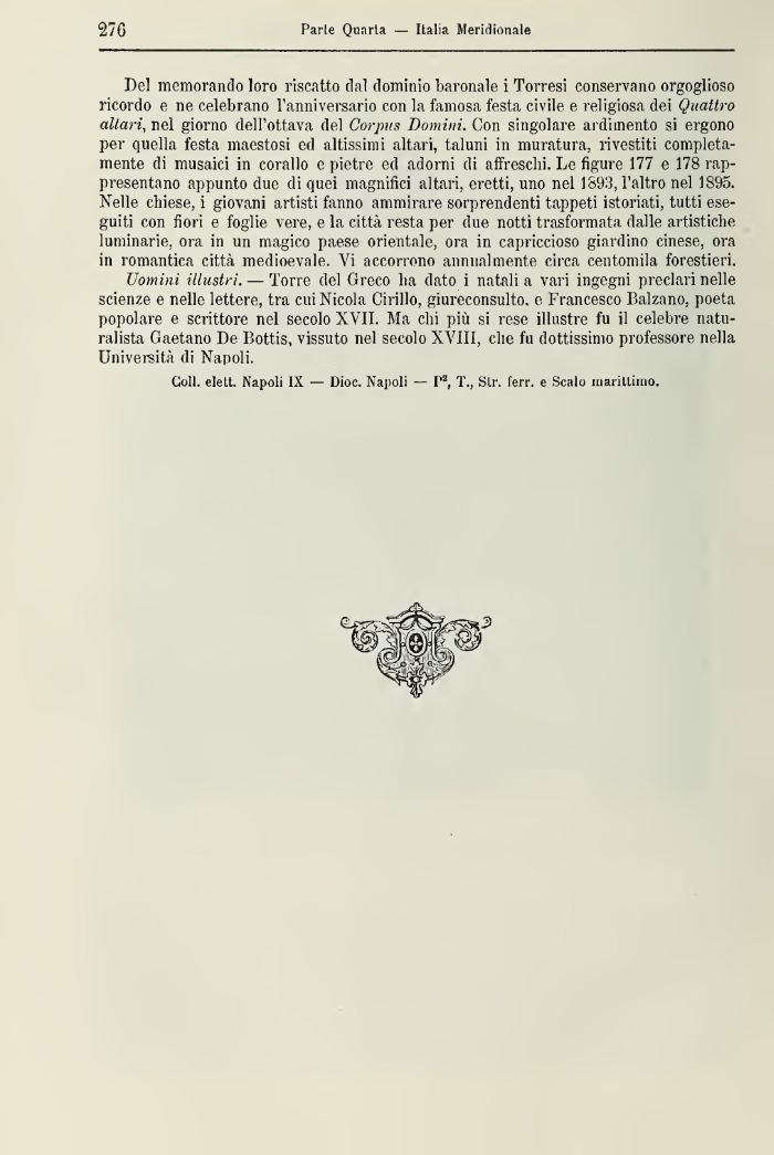 Del memorando loro riscatto rial dominio baronale i Torresi conservano orgoglioso ricordo e ne celebrano l'anniversario con la famosa festa civile e religiosa dei Quattro altari, nel giorno dell'ottava del Corpus Domini. Con singolare ardimento si ergono per quella festa maestosi ed altissimi altari, taluni in muratura, rivestiti completamente di musaici in corallo e pietre ed adorni di affreschi. Le figure 177 e 178 rappresentano appunto due di quei magnifici altari, eretti, uno nel 1893, l'altro nel 1895. Nelle chiese, i giovani artisti fanno ammirare sorprendenti tappeti istoriati, tutti eseguiti con fiori e foglie vere, e la città resta per due notti trasformata dalle artistiche luminarie, ora in un magico paese orientale, ora in capriccioso giardino cinese, ora in romantica città medioevale. Vi accorrono annualmente circa centomila forestieri.