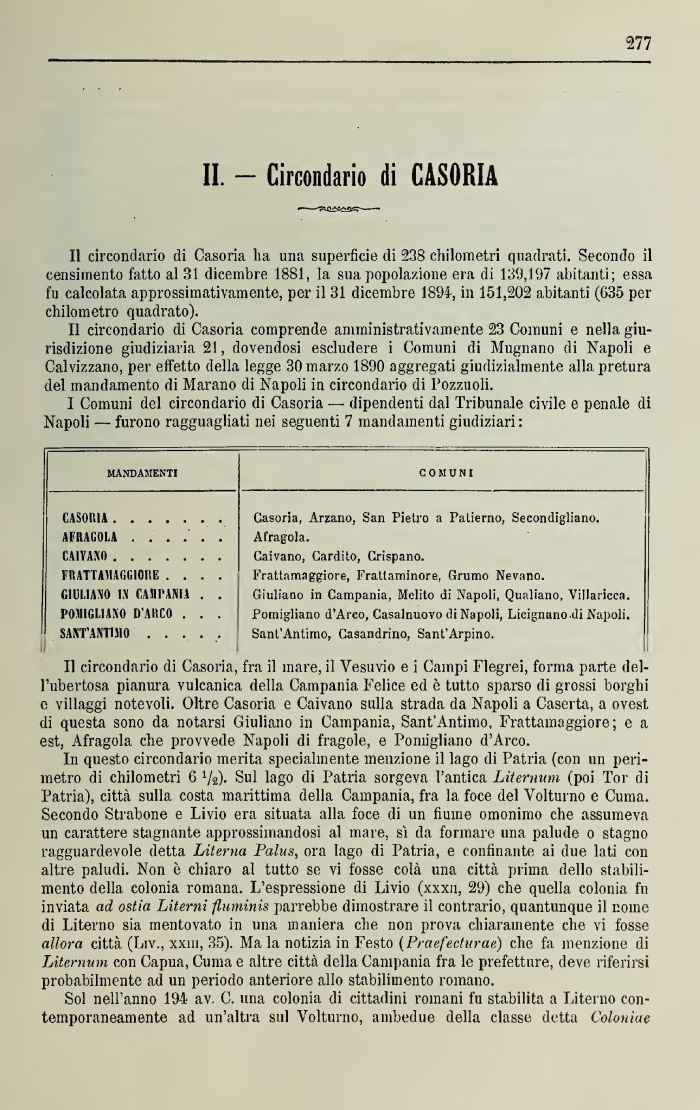 In questo circondario merita specialmente menzione il lago di Patria (con un perimetro di chilometri 6 Sul lago di Patria sorgeva l'antica Lìternum (poi Tor di Patria), città sulla costa marittima della Campania, fra la foce del Volturno e Cu ma. Secondo Strabene e Livio era situata alla foce di un iiuine omonimo che assumeva un carattere stagnante approssimandosi al mare, sì da formare una palude o stagno ragguardevole detta Literna Fatua, ora Iago di Patria, e confili ante ai due lati con altre paludi. Non è chiaro al tutto se vi fosse colà una città prima dello stabilimento della colonia romana. L'espressione di Livio (xxxn, 29) che quella colonia fu inviata ad ostia Literni fluminis parrebbe dimostrare il contrario, quantunque il nome di Literno sia mentovato in una maniera che non prova chiaramente che vi fosse allora città (Liv., xxm, 35). Ma la notizia in Festo (Praefeeturae) che fa menzione di Liternum con Capila, Cuma e altre città della Campania fra le prefetture, deve riferirsi probabilmente ad un periodo anteriore allo stabilimento romano.