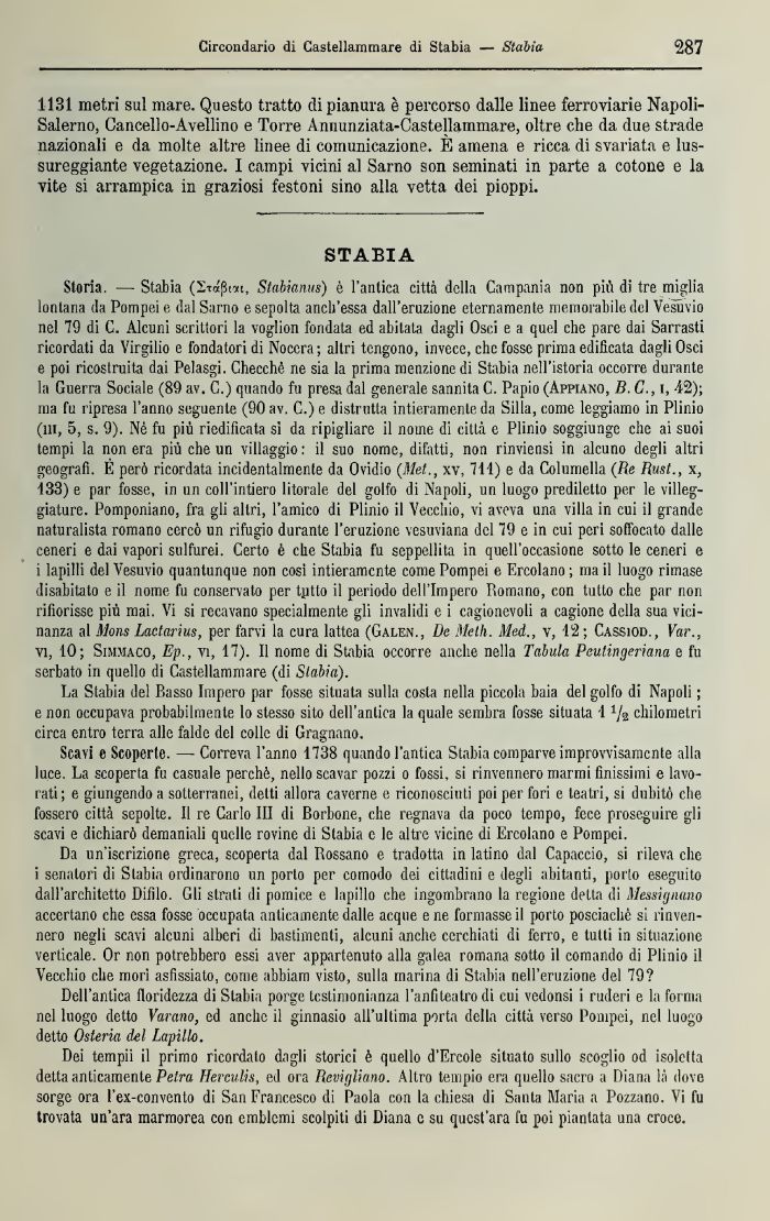 Storia. — Stabia ^rapwl Stabianus) è l'antica città della Campania non più di tre miglia lontana da Pompei e dal Sarno e sepolta anch'essa dall'eruzione eternamente memorabile del Vesuvio nel 79 di C. Alcuni scrittori la voglion fondata ed abitata dagli Osci e a quel che pare dai Sarrasti ricordati da Virgilio e fondatori di Nocera; altri tengono, invece, che fosse prima edificata dagli Osci e poi ricostruita dai Pelasgi. Checche ne sia la prima menzione di Stabia nell'istoria occorre durante la Guerra Sociale (89 av. C.) quando fu presa dal generale sannita C. Papio (Appiano, B. C., i, 42); ma fu ripresa l'anno seguente (90 av. C.) e distrutta intieramente da Siila, come leggiamo in Plinio (ni, 5, s. 9). Né fu più riedificata sì da ripigliare il nome di città e Plinio soggiunge clic ai suoi tempi la non era più che un villaggio: il suo nome, difatti, non rinviensi in alcuno degli altri geografi. É però ricordata incidentalmente da Ovidio (Mel.ì xv, 711) e da Columella (Ile Hust., x, 133) e par fosse, in un coll'intiero litorale del golfo di Napoli, un luogo prediletto per le villeggiature. Pomponiano, fra gli altri, l'amico di Plinio il Vecchio, vi aveva una villa in cui il grande naturalista romano cercò un rifugio durante l'eruzione vesuviana del 79 e in cui peri soffocato dalle ceneri e dai vapori sulfurei. Certo è che Stabia fu seppellita in quell'occasione sotto le ceneri e i lapilli del Vesuvio quantunque non così intieramente come Pompei e Ercolano ; ma il luogo rimase disabitato e il nome fu conservato per tjitto il periodo dell'Impero Romano, con tutto che par non rifiorisse più mai. Vi si recavano specialmente gli invalidi e i cagionevoli a cagione della sua vicinanza al Mons Ladarius, per farvi la cura lattea (Gale.v, De Meth. Mei,, v, 12; Cassiod., Var., vi, 10; Simmaco, Ep., vi, 17). Il nome di Stabia occorre anche nella Tabula Peutingeriana e fu serbato in quello di Castellammare (di Slabia).