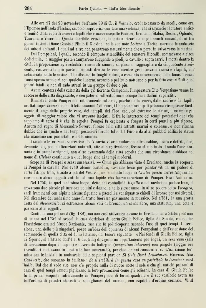 Continuarono gli scavi (fig. 182), ma non cosi attivamente come in Ercolano ed a Stabia; ciò non di manco nel 1751 si scopri la casa doviziosa di certa Giulia Felice, figlia di Spurio, come dice l'iscrizione ora nel Museo Nazionale, casa che fu poi ricoperla secondo l'uso di quei tempi. L'iscrizione, una delle più singolari, porge un'idea dell'opulenza di alcuni Pompeiani e dell'estensione del commercio di quella città ed è, in italiano, del tenore seguente : « Nei fondi di Giulia Felice, figlia di Spurio, si affittano dall'I al 0 degli hlj di agosto un appartamento per bagni, un venenum (sala di ricreazione dopo il bagno) e novecento botteghe (nongentum tabernae) con pergole (loggie ove ì venditori mettevano in mostra le loro mercanzie), per cinque anni consecutivi ». L'iscrizione termina con le iniziali in maiuscolo delle seguenti parole: Si Quis Dumi Lcnocinium Exerceal Non Conducilo, clic suonano in italiano : Se si stabilirà in questa casa vn postribolo la locazione sarà nulla. Dal che si vede che non c'è proprio nulla di nuovo sotto il sole e che gli antichi padroni di casa di quei tempi remoti pigliavano le loro precauzioni come gli odierni. La casa di Giulia Felice fu la prima scoperta intieramente in Pompei ; era di forma quadrata e il suo vestibolo aveva un bell'ordine di pilastri stuccati a somiglianza del marma, con capitelli d'ordine corinzio. Vi si