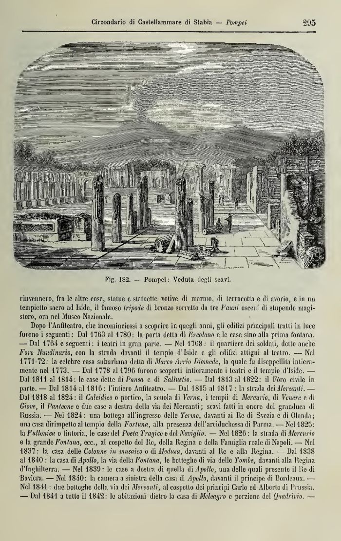 Dal 1YM e seguenti : i teatri in gran parte. Nel 1708 : il quartiere dei soldati, detto anche Foro Nundinario, con la strada davanti il tempio d'Iside e gli edifizi attigui al teatro Nel 1771-72: la celebre casa suturila mi detta di Marco Arri o Diomede, la quale fu diseppellita intieramente nel 1773. Dal 1778 al 1796 furono scoperti intieramente i teatri e il tempio d'Iside. Dal 1811 al 1814 le case dette di Pausa e di Sallustio. Dal 1813 al 1822: il Fσro civile in parte. Dal 1814 al 1816: l'intiero Anfiteatro. Dal 1815 al 1817 : la strada dei Mercanti. Dal 1818 al 1824 : il Calcidieo o portico, la scuola di Verna, i tempii di Mercurio, di Venere e di Giove, il Panteone c due case a destra della via dei Mercanti ; scavi fatti in onore del granduca di Russia. Nei 1824: una bottega all'ingresso delle Tenne, davanti ai Ile di Svezia e di Olanda; una casa dirimpetto al tempio della Fortuna, alla presenza dell'arciduchessa di l'arma.. Nel 1825: la Fulloniea o tintoria, le case del Poeta Tvatjico e del Naviglio. Nel 1826 : la strada di Mercurio e la grande Fontana, ecc., al cospetto del Ile, della Regina e della Famiglia reale di Napoli. Nel 1837: la casa delle Colonne in musaico o di Medusa, davanti al Re e alla Regina. - Dal 1838 al 1810 : la casa di Apollo, la via della Fontana, le botteghe di via delle Tombe, davanti alla Regina d'Inghilterra. Nel 1839: le case a destra di quella Ai Apollo, uiia delle quali presente il Re di Baviera, Nel 18i0: la camera a sinistra della casa di Apollo, davanti il principe di Bordeaux. Nel 1841 : due botteghe della via dei Mercanti, al cospetto dei principi Carlo ed Alberto di Prussia.