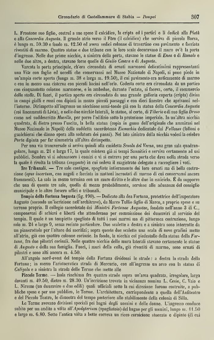 Tempio della Fortuna Angusta (fig. 190). —Dedicato alla dea Fortuna, protettrice dell'imperatore Augusto (secondo un'iscrizione nell'architrave), da Marco Tullio figlio di Marco, a proprie spese e su terreno proprio. Il collegio sacerdotale dei Ministri Fortunae Auguslae, fondato nell'anno 3 di C., componevasi di schiavi e liberti che attendevano per commissione dei duumviri al servizio del tempio. Il quale è un tempietto spogliato di tutti i suoi marmi ma di pittoresca costruzione, lungo solo m. 24 e largo 9, senza recinto particolare. Due scalette a destra e a sinistra sono interrotte da un pianerottolo per l'altare dei sacrifizi ; sopra queste due scalette una scala di nove gradini mette all'atrio, già con quattro colonne corinzie. In fondo, la nicchia col piedestallo della statua della Fortuna, fra due pilastri corinzii. Nelle quattro nicchie delle mura laterali stavano certamente le statue di Augusto e della sua famiglia. Fuori, i muri della cella, già rivestiti di marmo, sono ornati di pilastri e sono alti ancora in. 4.50.