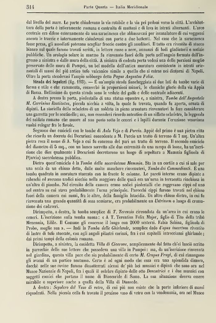 Strada dei Sepolcri (fig. 103). — E un'ampia strada fiancheggiata ai due lati da tombe varie di forma e stile e elio rammenta, comecché in proporzioni minori, le classiche glorie della via Appia di l'ionia. Bellissime da questa strada sono le vedute del golfo e delle eontrade adiacenti.